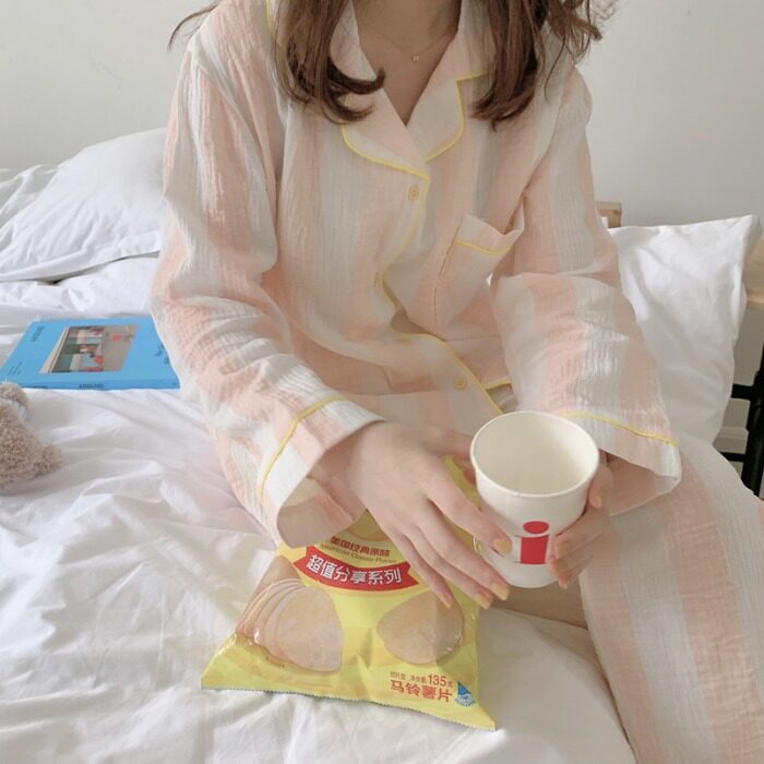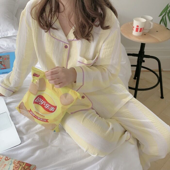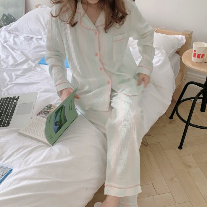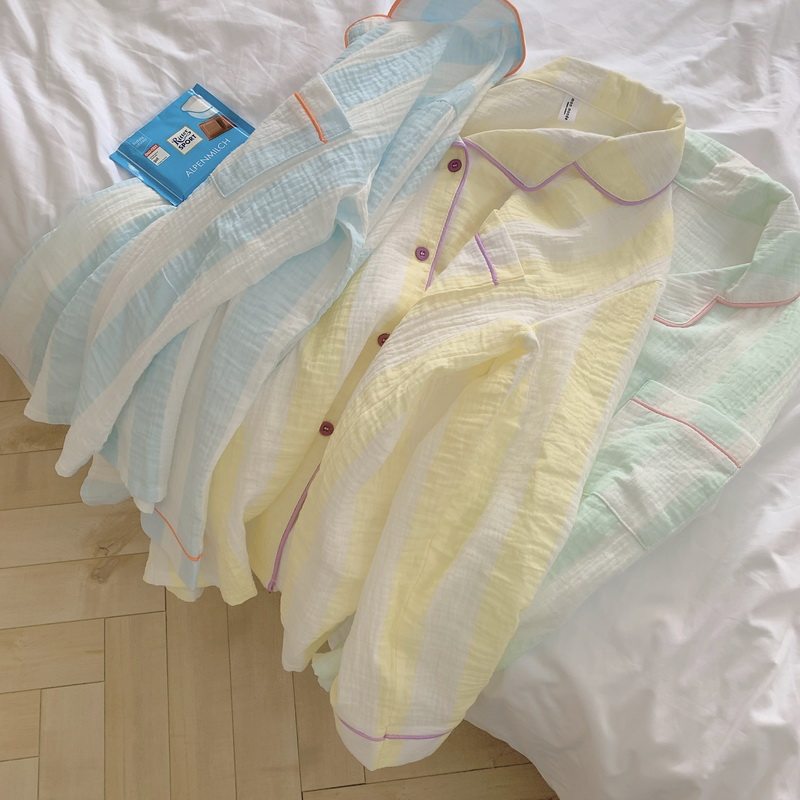 Small fresher fit color ~ popularity style Korean version of minimalist striped pure cotton pyjamas women's spring and autumn family ju serve two style suits