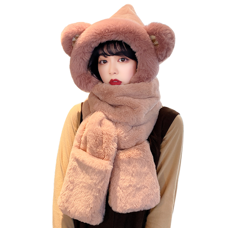 Bear hat and scarf all-in-one women's autumn and winter all-match 2021 new Western style cute warm plush winter hat
