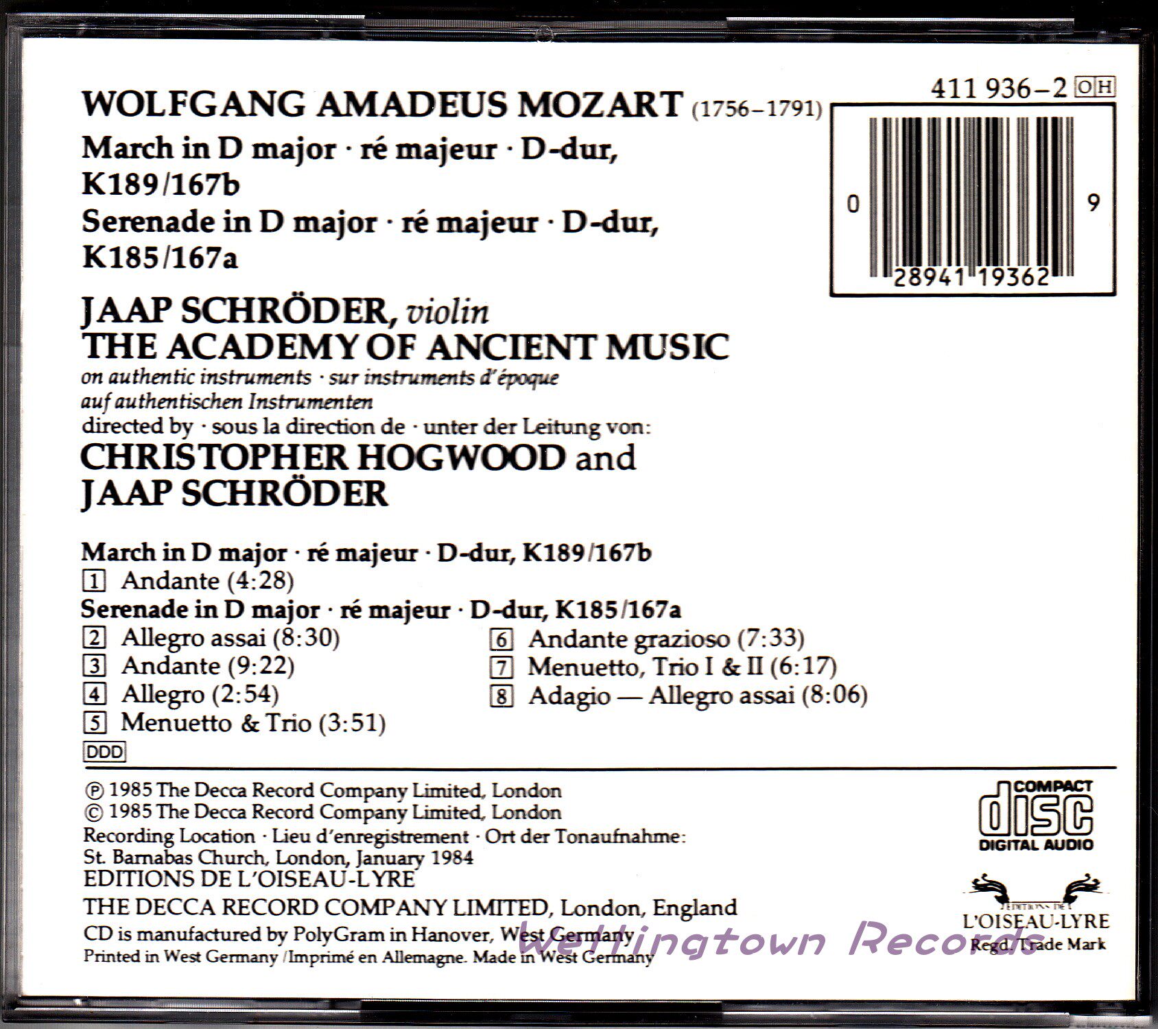Hogwood Schroeder Orchestra of the Ancient Conservatory Mozart March Serenade