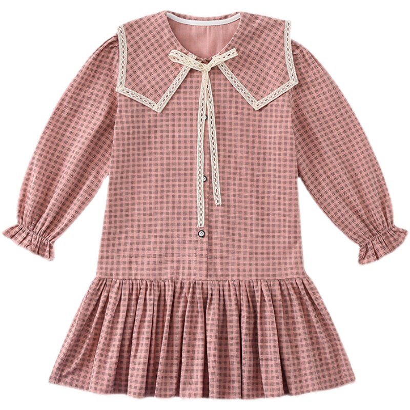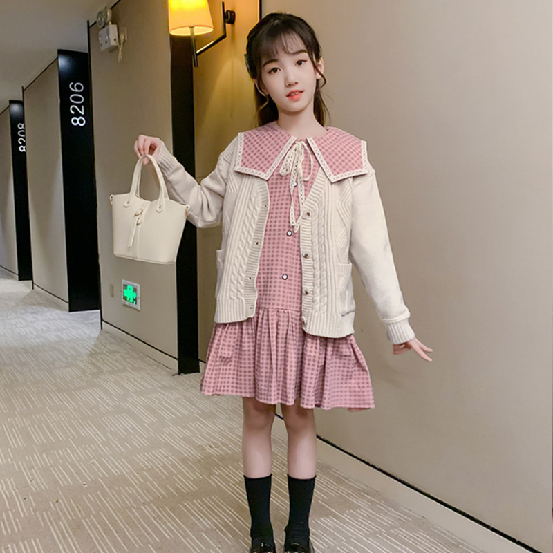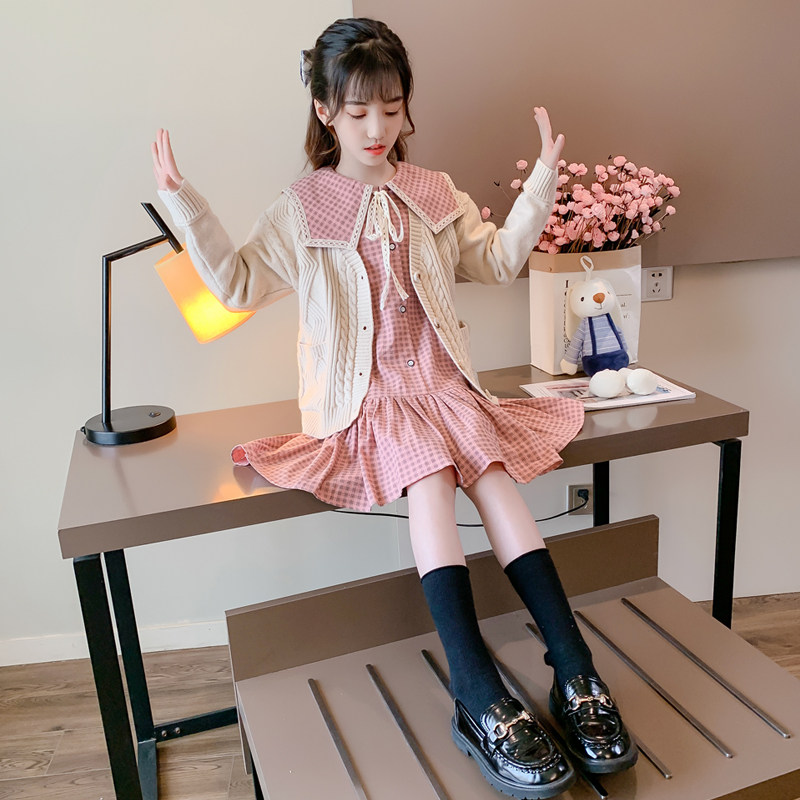 Girls plaid dress spring and autumn foreign style college wind sweater suit big children two-piece tie skirt trendy