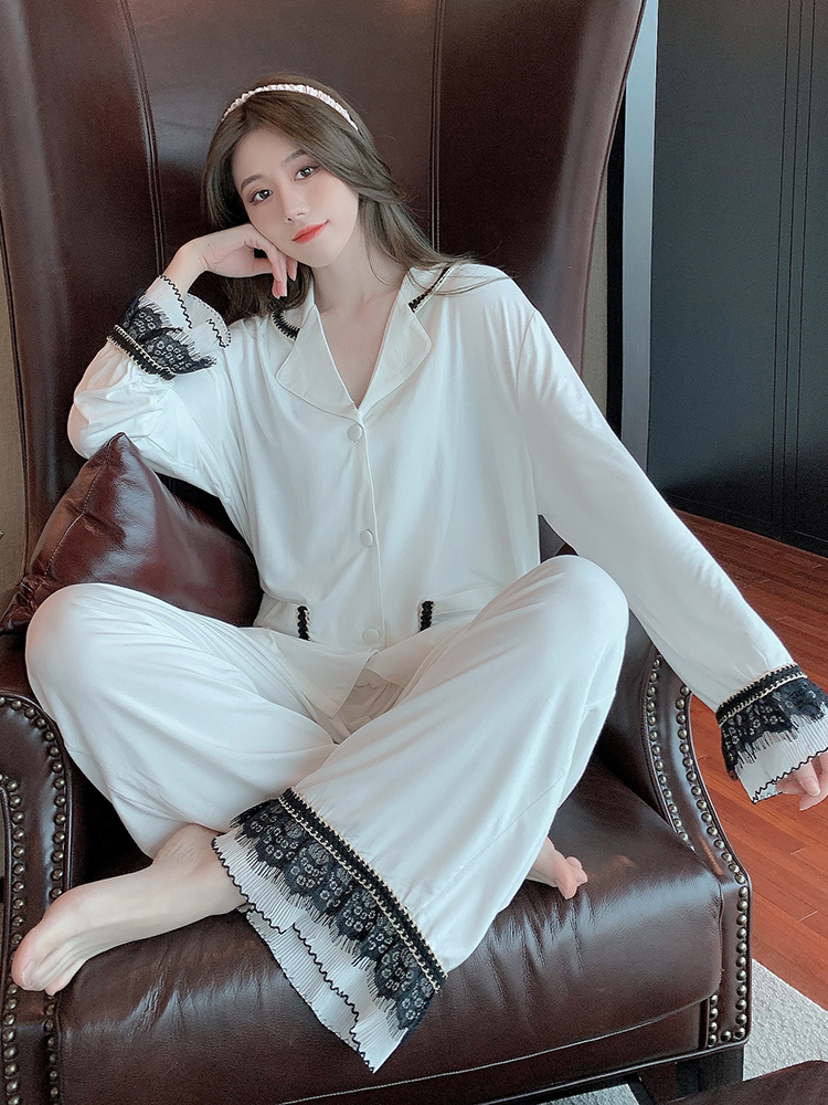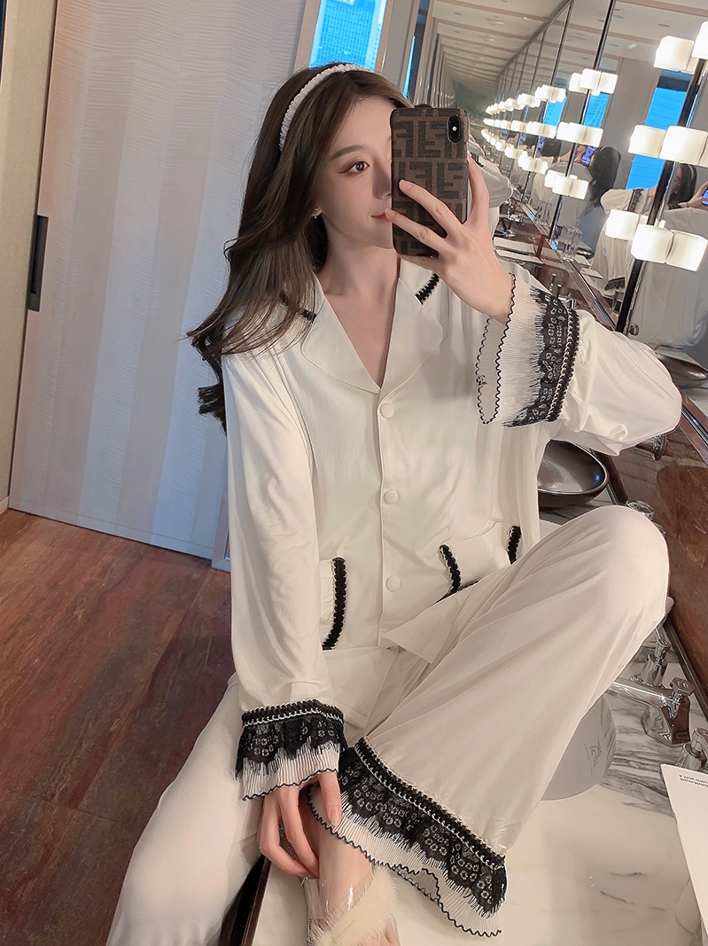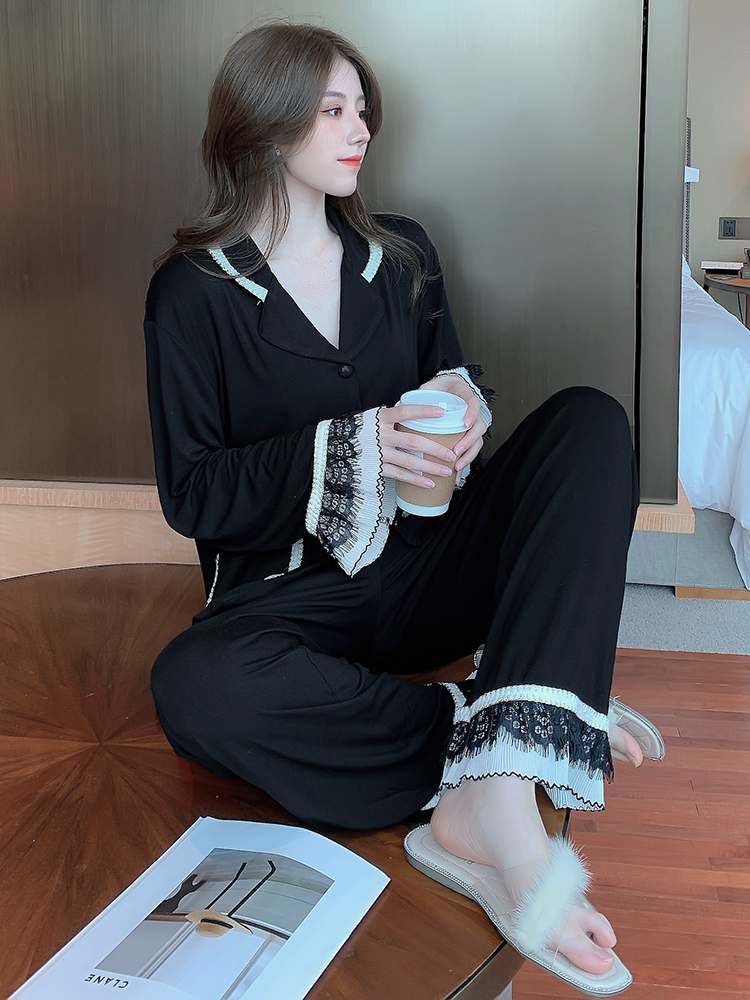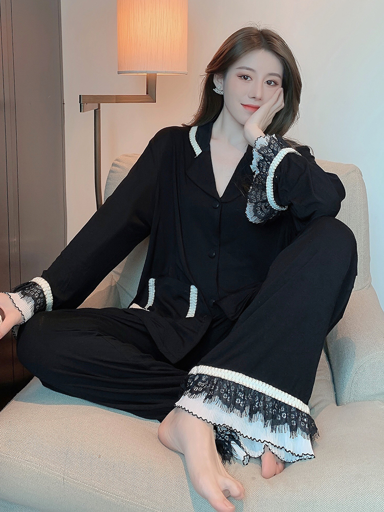 Angelina zl Model pajamas woman spring and autumn cotton sexy lace side black home suit