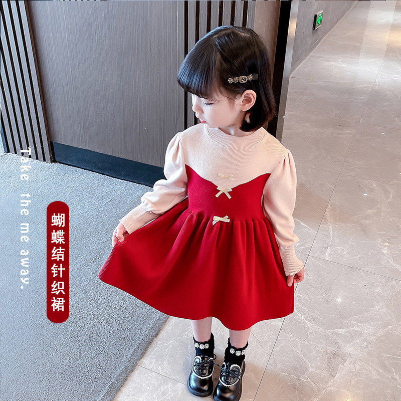 Girl Spring Clothing Dress Dress 2023 New Female Baby Spring Autumn Child Clothing Foreign Air Children Butterfly Knot Knitted Princess Dress