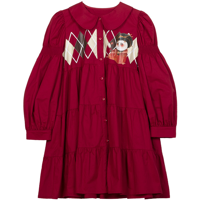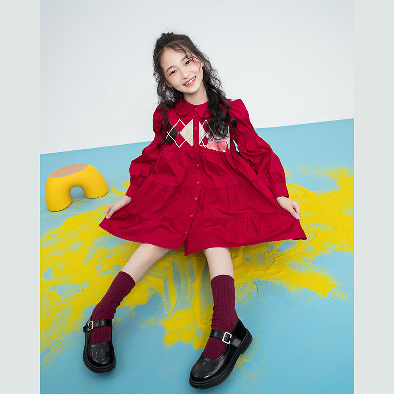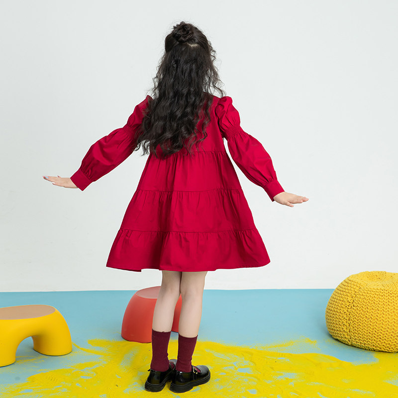 Parent-child doll collar children's long dress 2022 spring thin section girls puff sleeve red skirt mother and daughter models
