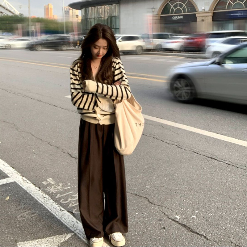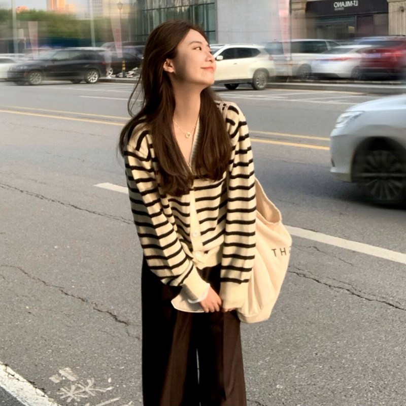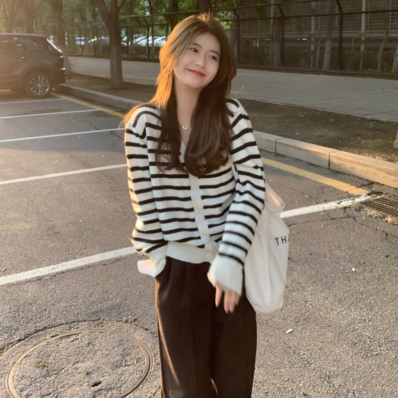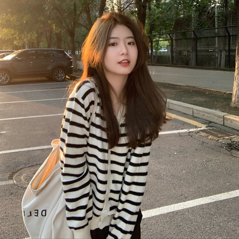 2022 New Early Spring Han Department Lazy Wind Black And White Striped Sweater Knitted Cardigan with a small crowdjacket