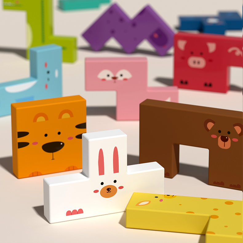 Magnetic Animal Tetris (16 bifacial puzzles with 11 animal building blocks)
