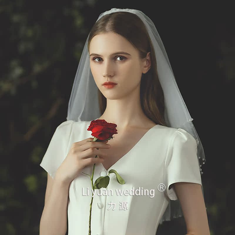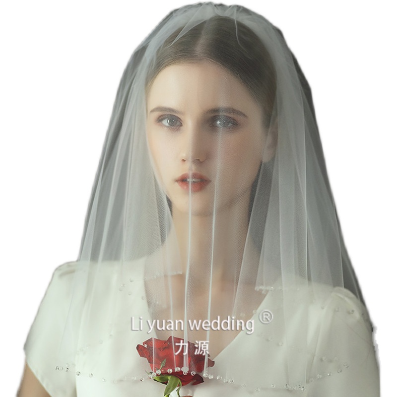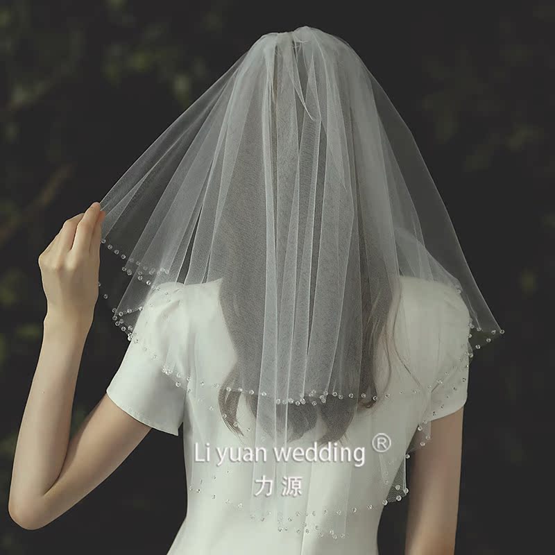 2021 Summer new Korean bridal head yarn Short double sensual minimalist with hand sewn beads wedding mesh yarn headwear