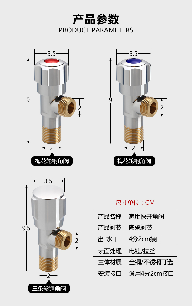 Three wheels thickened angle valve (hot and cold universal) 1 grain red mark thickened angle valve 1 grain blue mark thickened angle valve 1 grain copper tee angle valve 1 grain three wheels thickened copper angle valve 2 grain red blue mark thickened copper angle valve pair of three