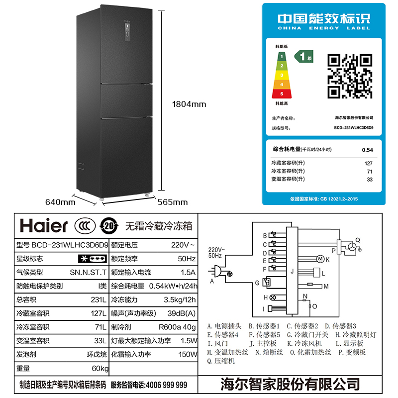 Haier 231L three-door fully variable temperature refrigerator level double frequency conversion energy saving rental home small air-cooled intelligent refrigerator