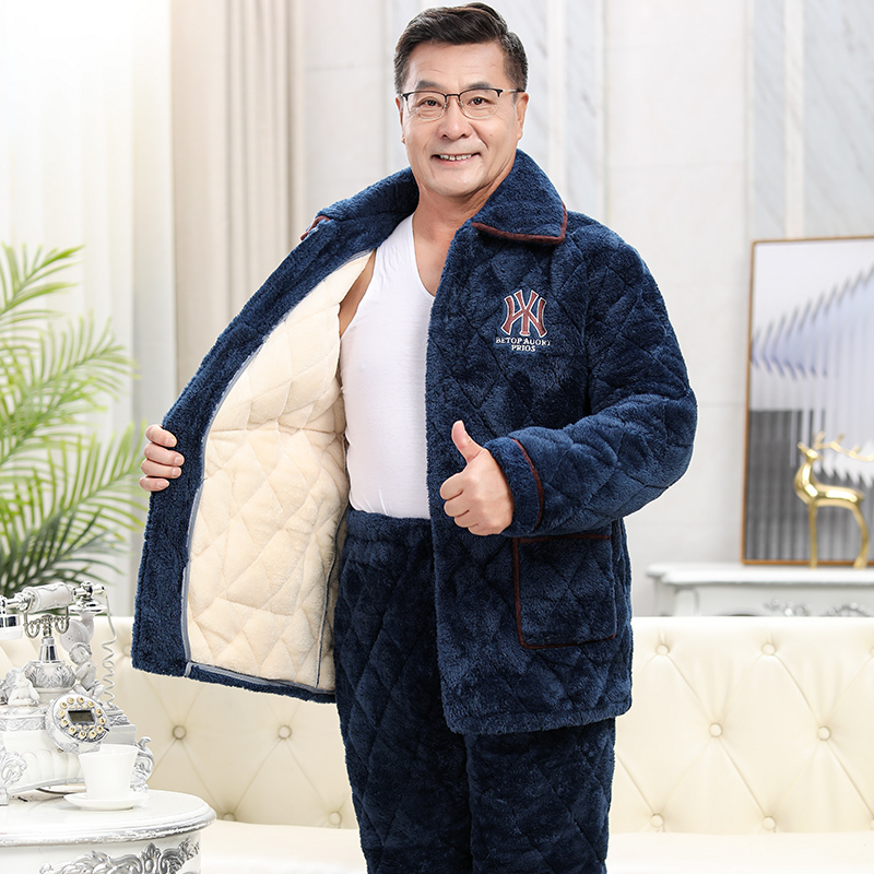 Men's Sleeping Clothes Autumn Winter Three Layers Thickened Gushed Coral Suede Nip Cotton Warm Mid Aged Dad's Home Suit Suit-Taobao