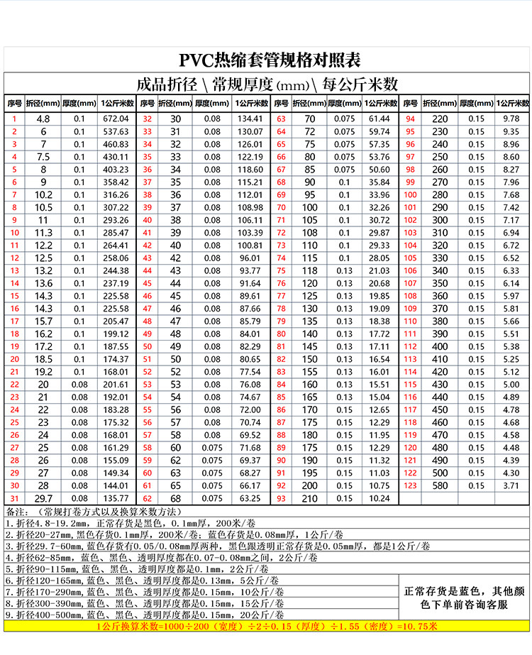 Transparent flattened width 70mm (length 61 m KG) thickness 0.08mm transparent flattened width 75mm (length 57 meters KG) thickness 0.08mm transparent flattening width 80mm (length 53.5 meters KG) thickness 0.08mm transparent flattened width 85mm (length 50 meters KG) thickness 0.08mm transparent flattened width 95mm (length 34 meters KG) thickness 0.1mm transparent flattening width 105mm (length 30.5 meters KG) thickness 0.1mm transparent flattened width 110mm ( Length 29 m KG) Thickness 0.1mm Transparent flattened width 115mm (length 28m KG) Thickness 0.1mm Transparent flattened width 130mm (length 19m KG) Thickness 0.13mm Transparent flattened width 135mm (length 18m KG) Thickness 0.13mm Transparent flattened width 145mm (length 17m KG) Thickness 0.13mm Transparent color Other sizes can consult customer service