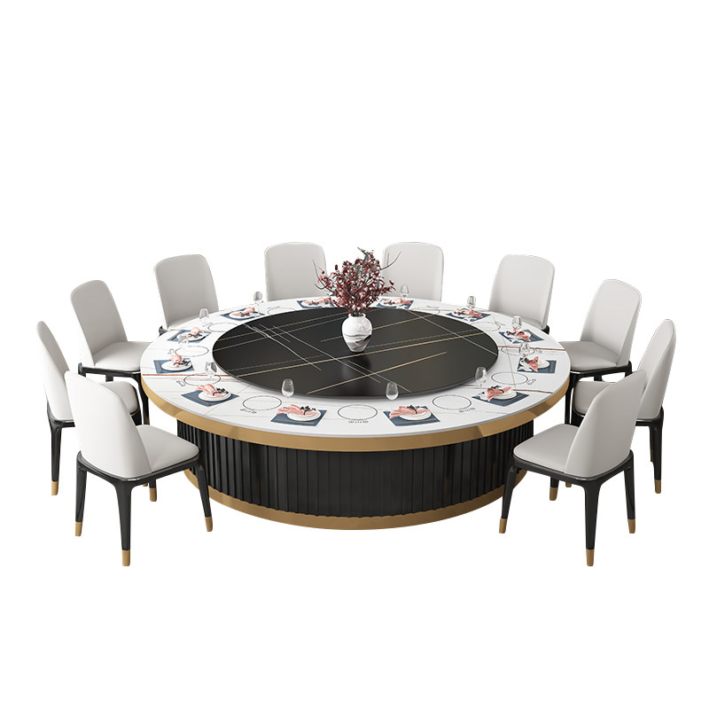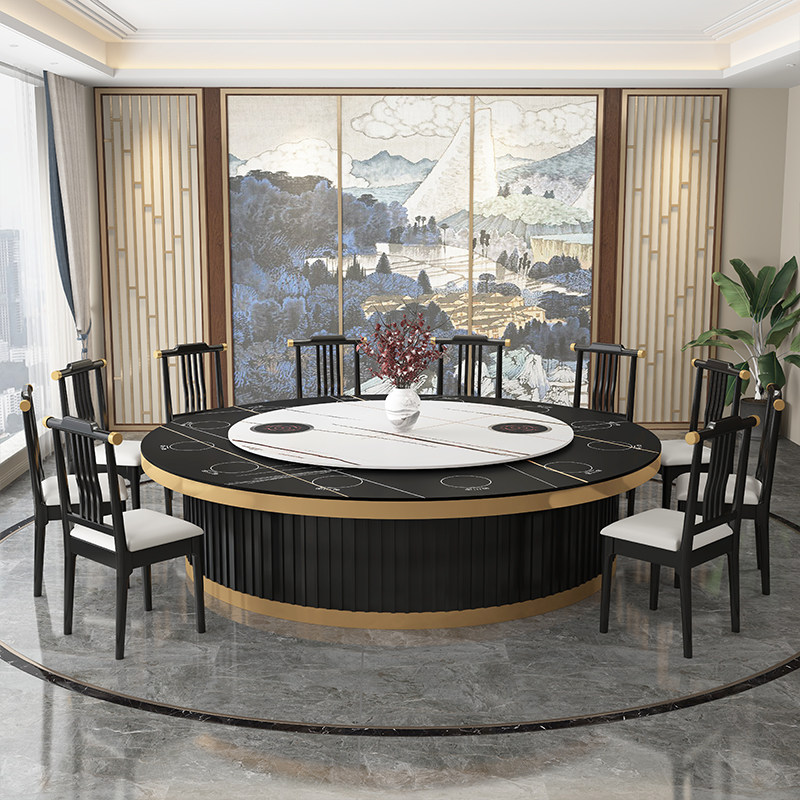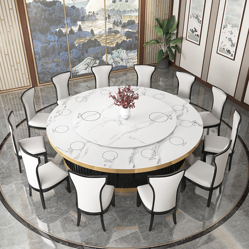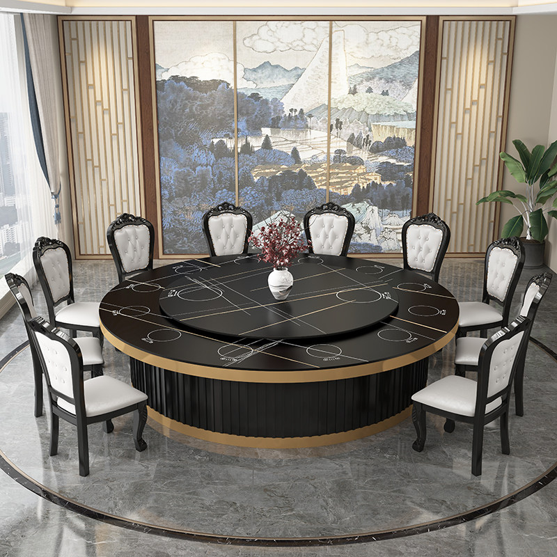 New Chinese hotel solid wood high-end electric dining table and chair combination 15 people 20 people marble slate restaurant large round table