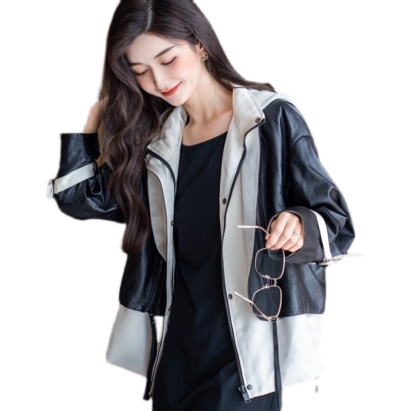 The new leather dress in 2023 - a - piece of female fur clothes with a loose acetic acid jacket black and white two - piece