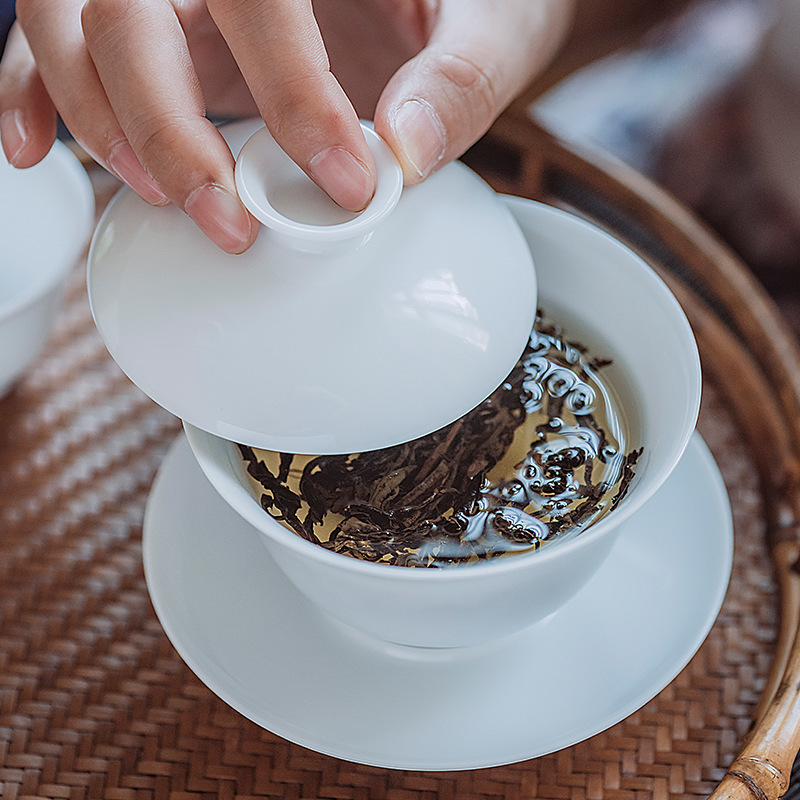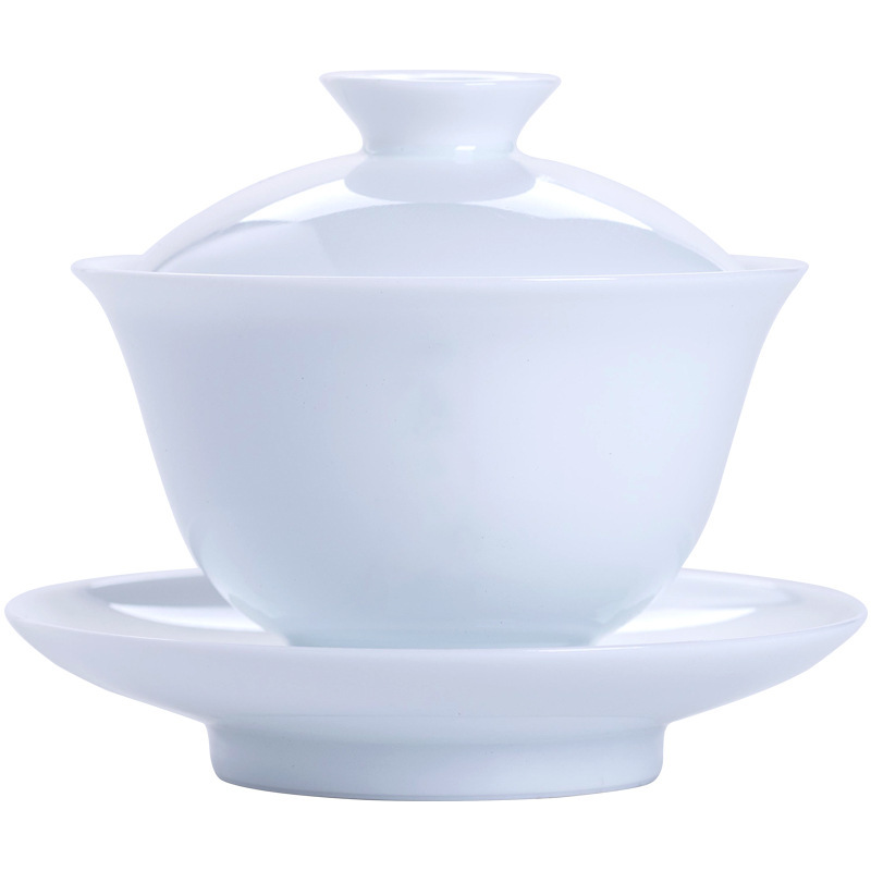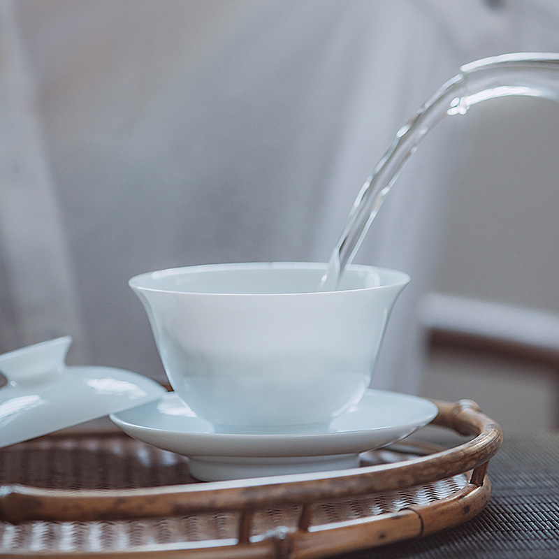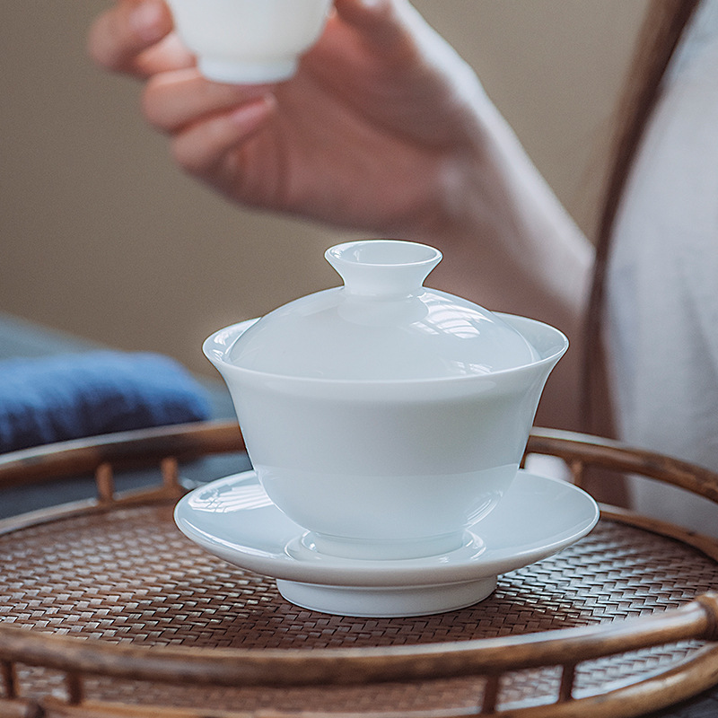 Jingdezhen Sweet White Glaze Jade Clay White Porcelain Three only cover bowl Gongfu Tea furniture Set Ceramic Tea Cup Whole Set Green Flower Porcelain