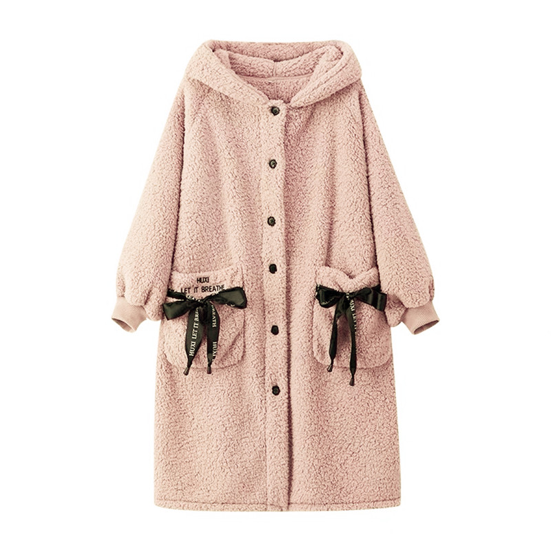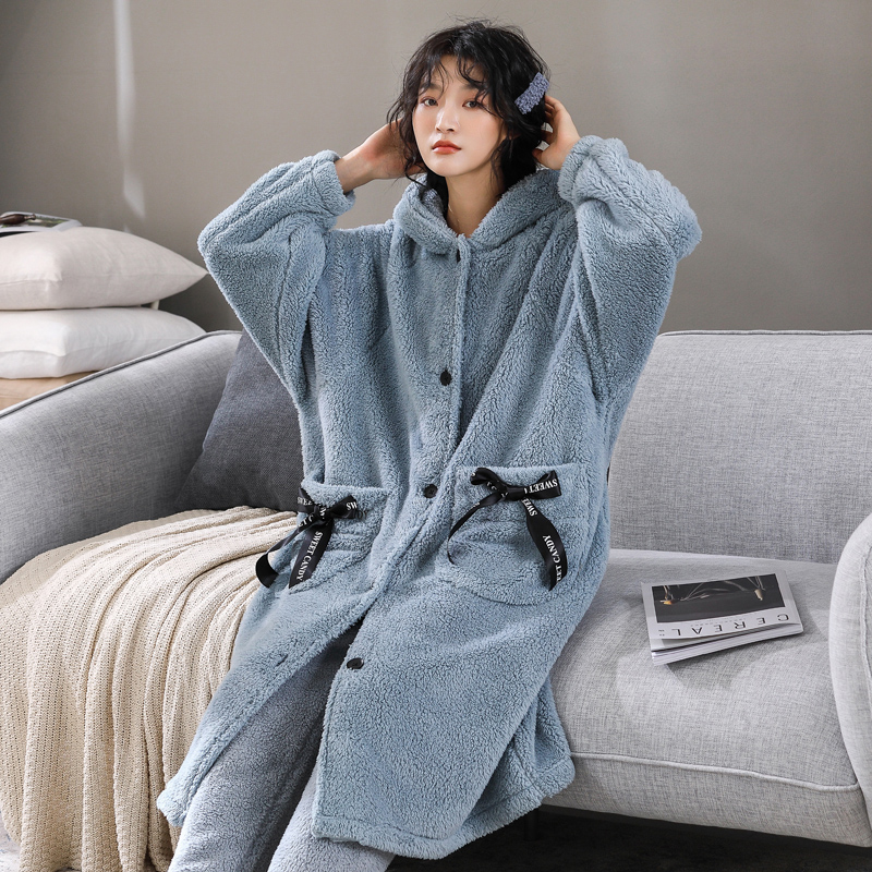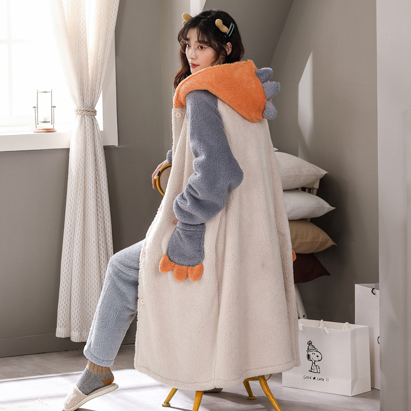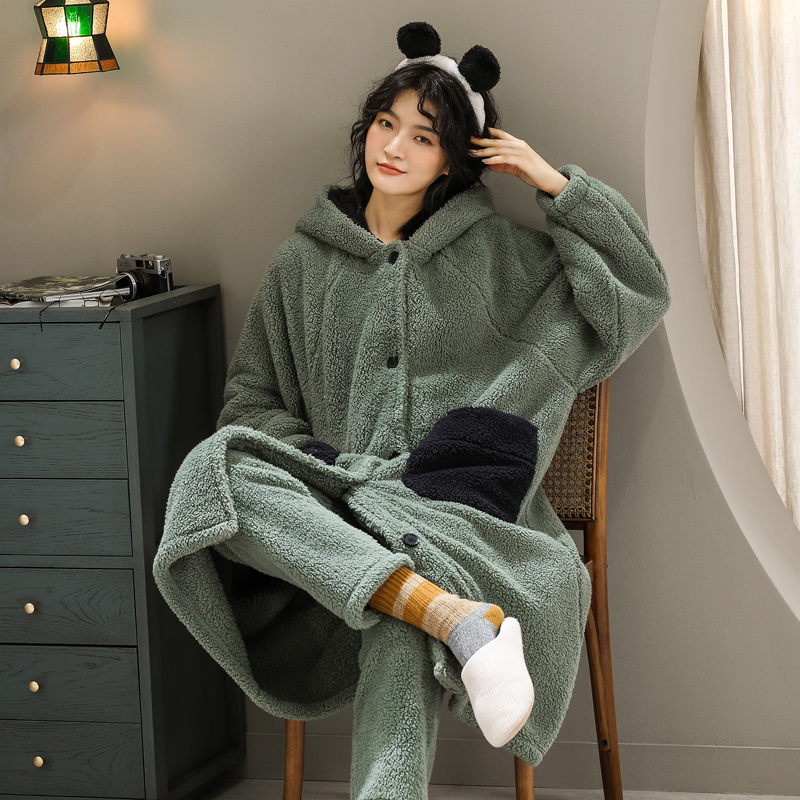 Gold velvet pajamas women's autumn and winter thickened and velvet bathrobe cute long lamb velvet large size warm nightgown set