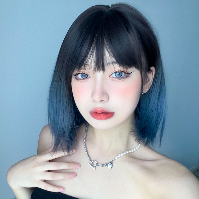 Wig female short hair summer natural full headgear gradient haze blue short hair modeling simulation human hair wave wig set