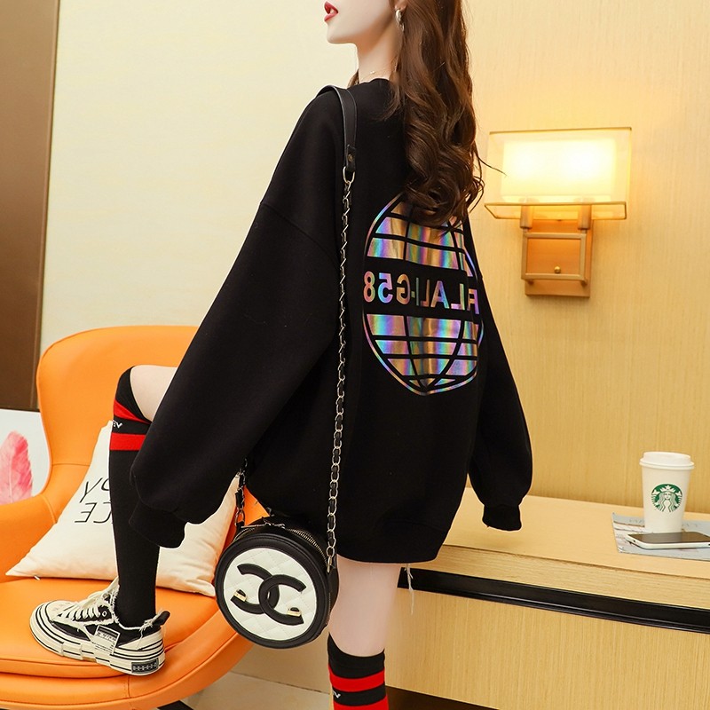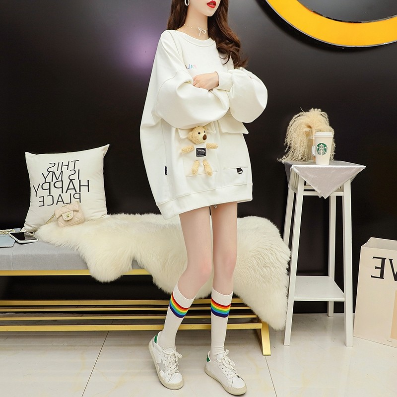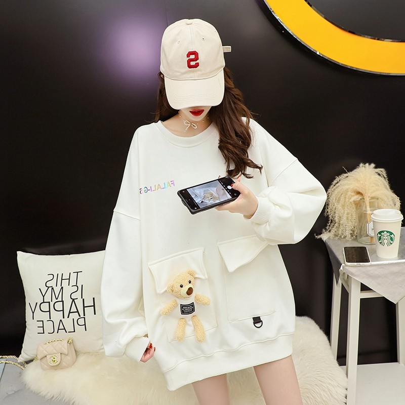 Little bear thick cotton T women's autumn 2022 new Korean version of loose lazy wind plus velvet crew neck top women's design sense of niche