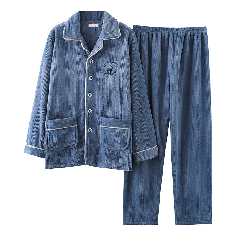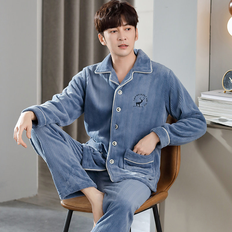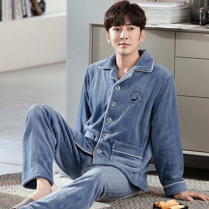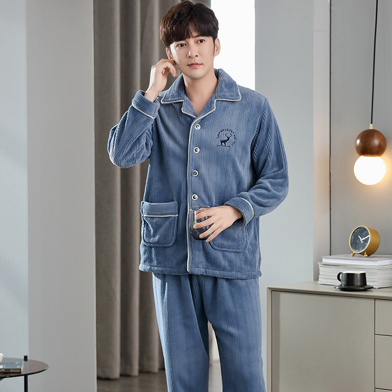 Coral velvet pajamas men's winter lapel long-sleeved new large size thickened flannel cardigan home service autumn and winter