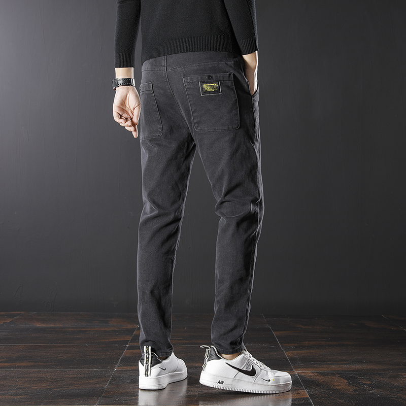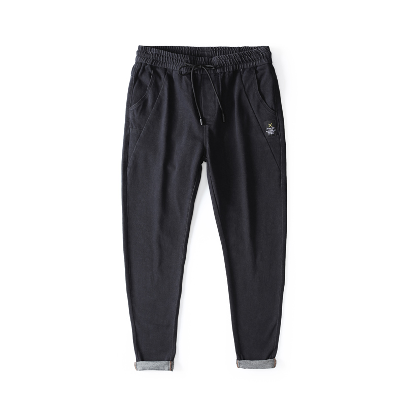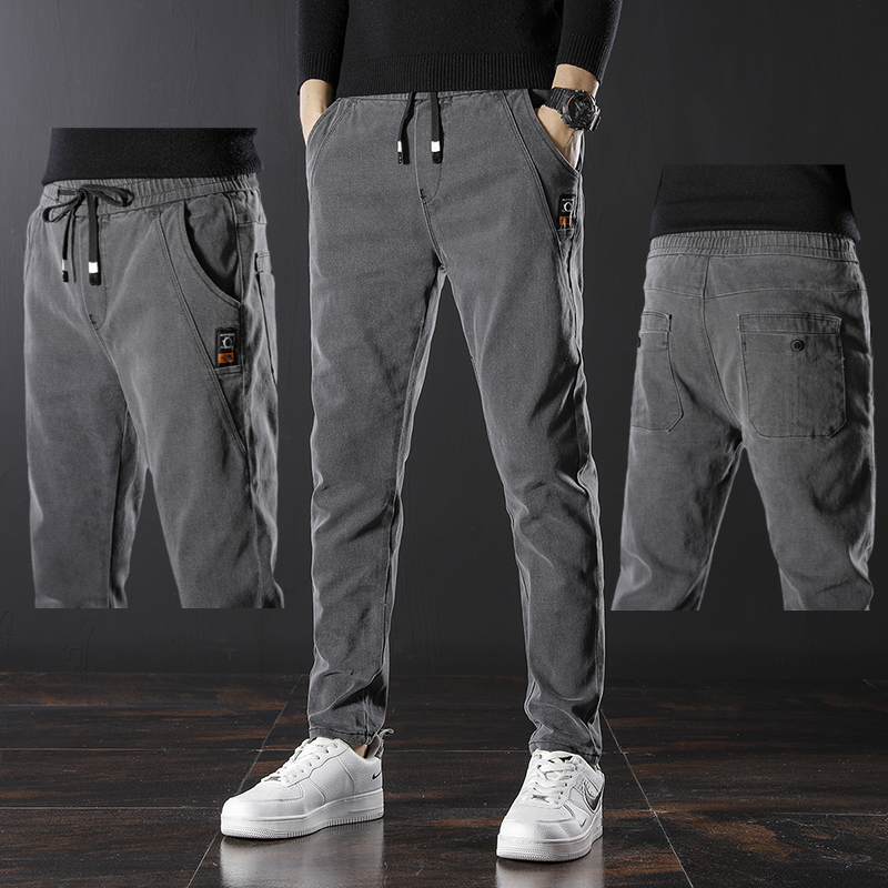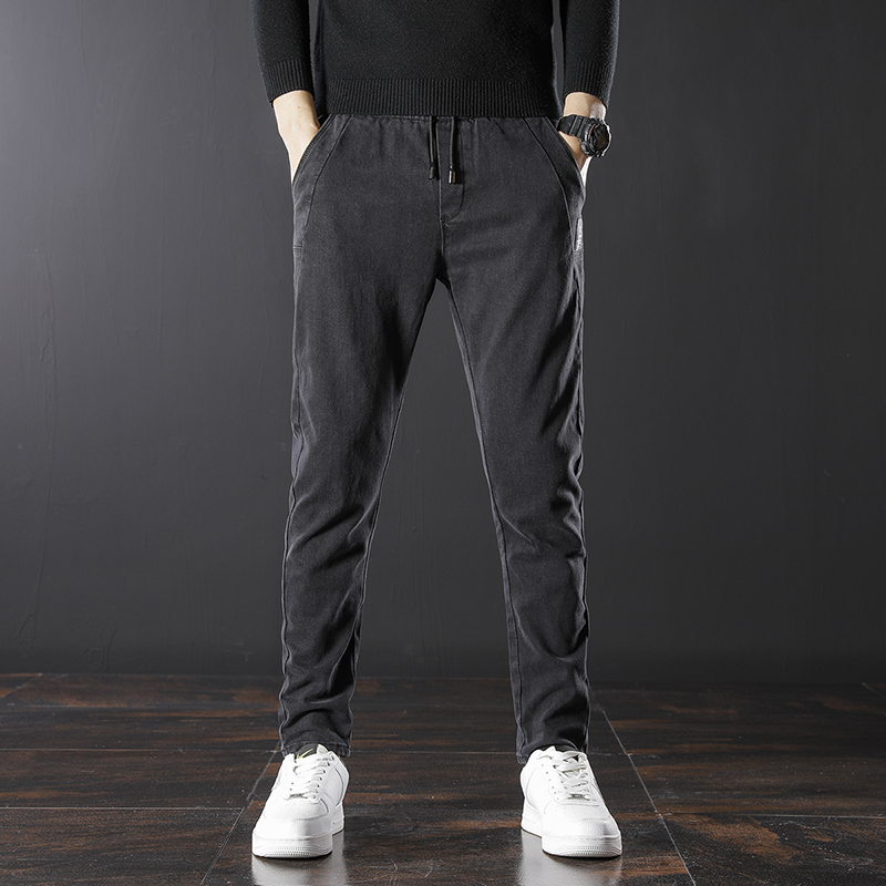 Jeans men long pants summer slim fit tightness waist casual straight cylinder drawing rope with small feet casual lacing pants