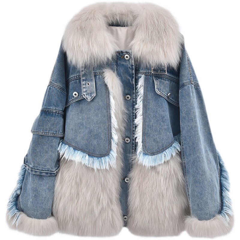 2022 new fox fur stitching denim pie to overcome women's medium and long version age-reducing fur coat young fashionable and warm