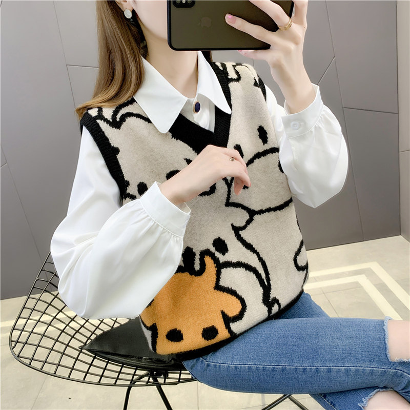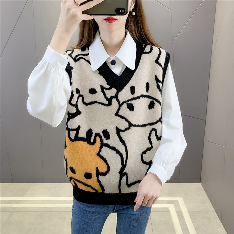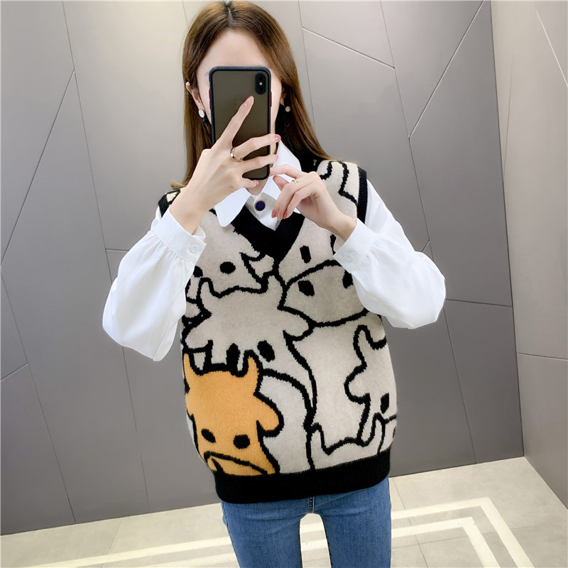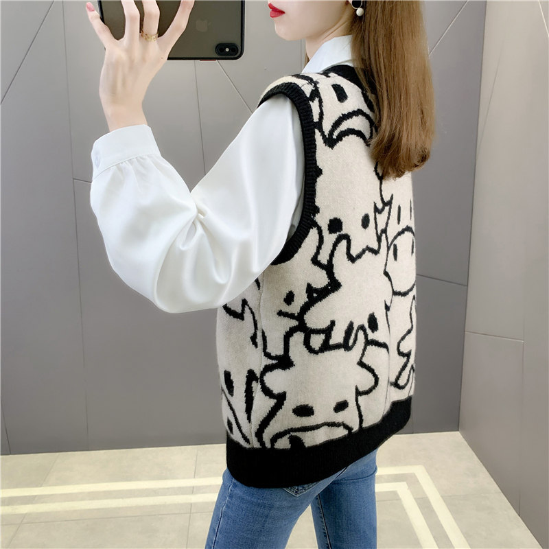 2021 Korean version of autumn new Aging Retro Jacquard V collar waistcoat Waistcoat Knitwear outside wearing sweater Shoulder Tide