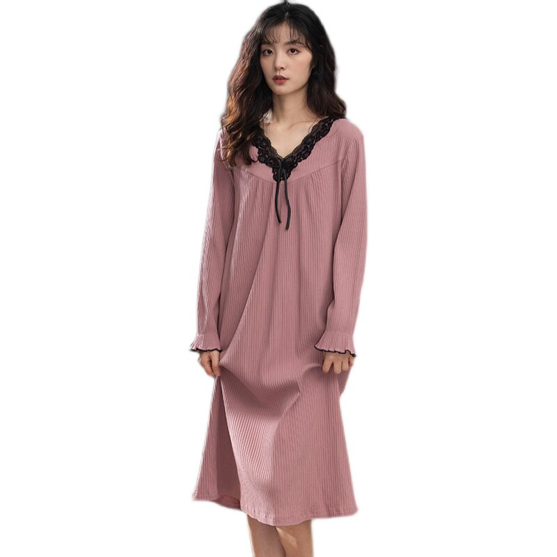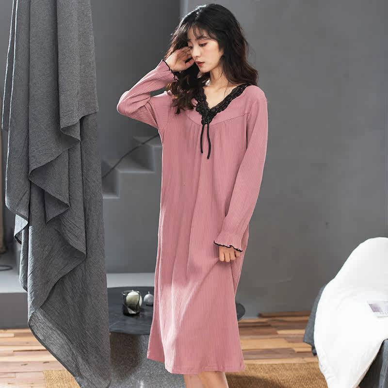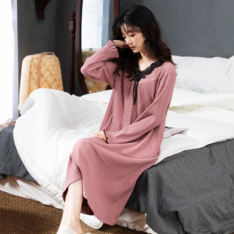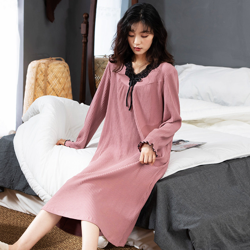 2021 new cotton nightdress women's long version over the knee autumn long-sleeved lace home pajamas dress spring and autumn models
