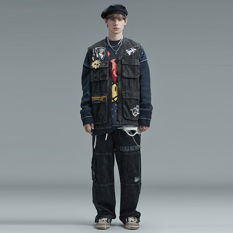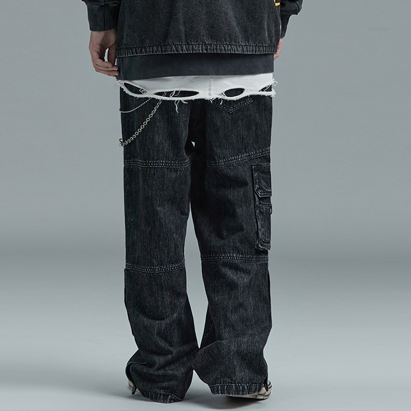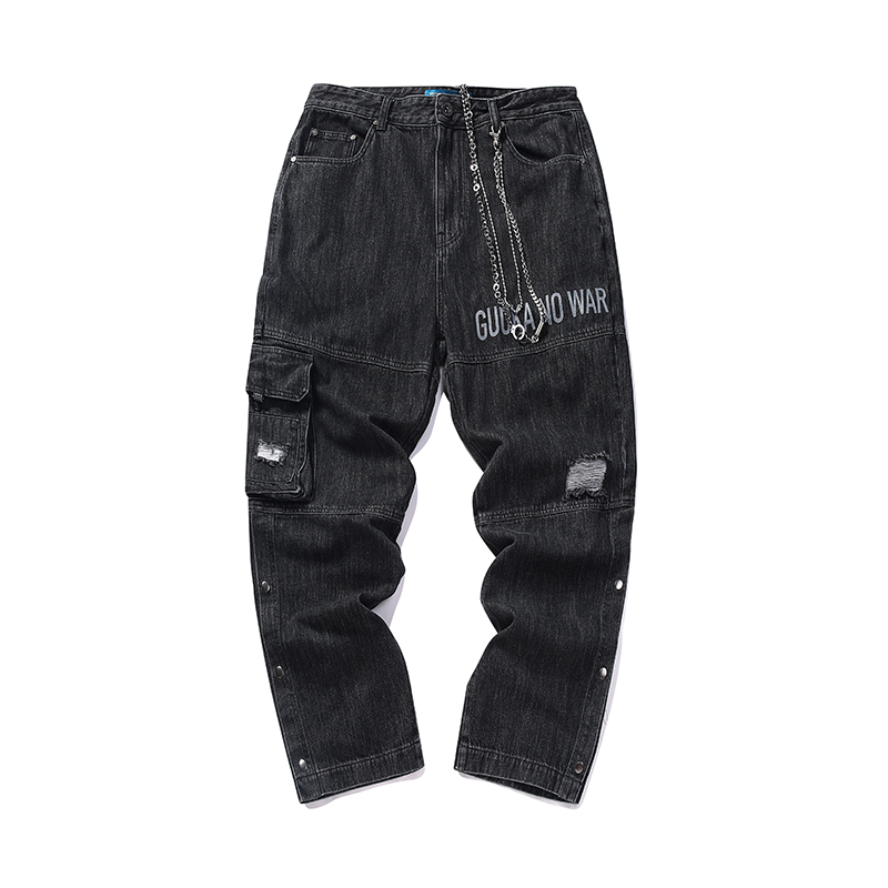 GUUKA Tide Cards Black Jeans Men's Fall Student Hip Hop multiple bags Hole Tooling Straight Barrel Jeans Loose