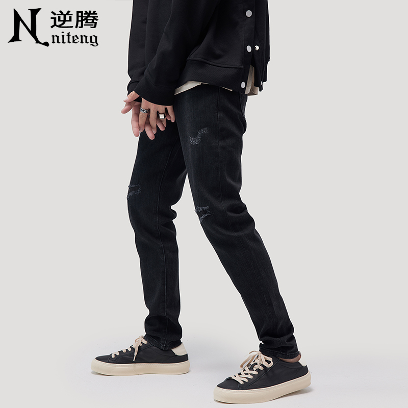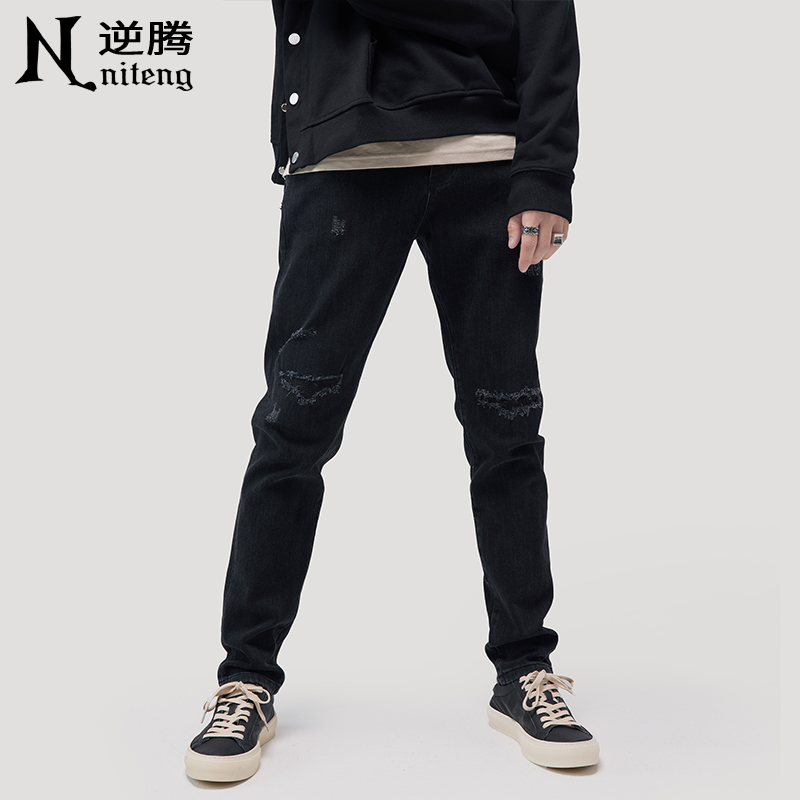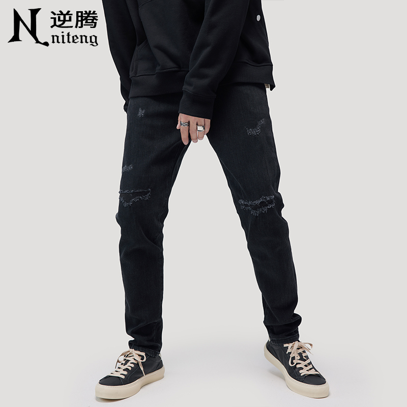 Spring and autumn in black Broken Cave Jeans Men's Body Straight Barrel Long Pants Tide Cards High Street Smoke Tubes Pants Men Summer
