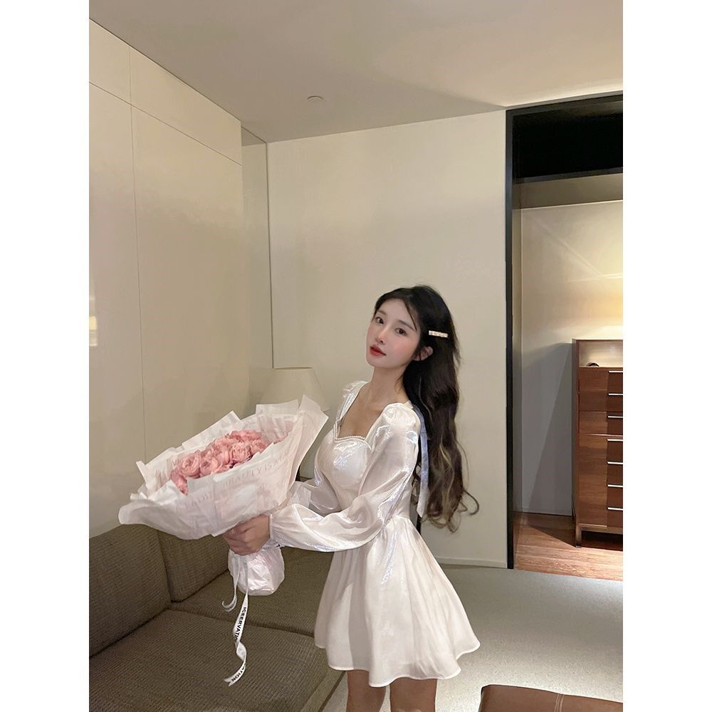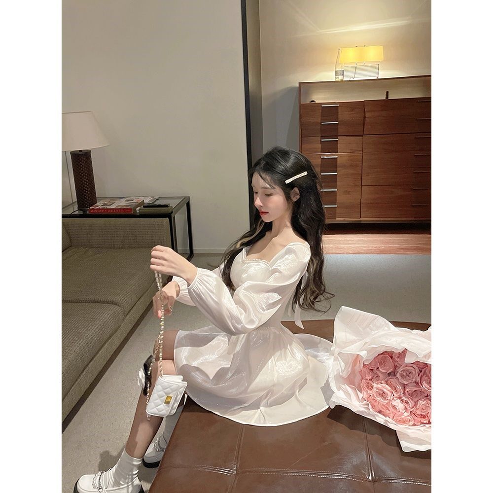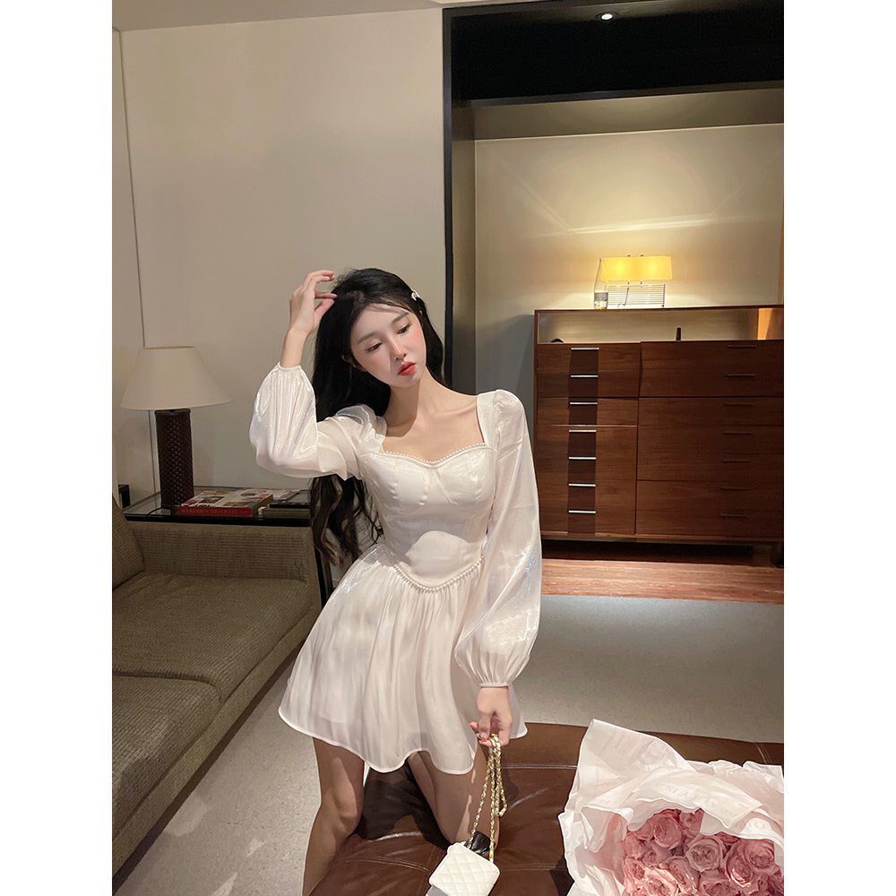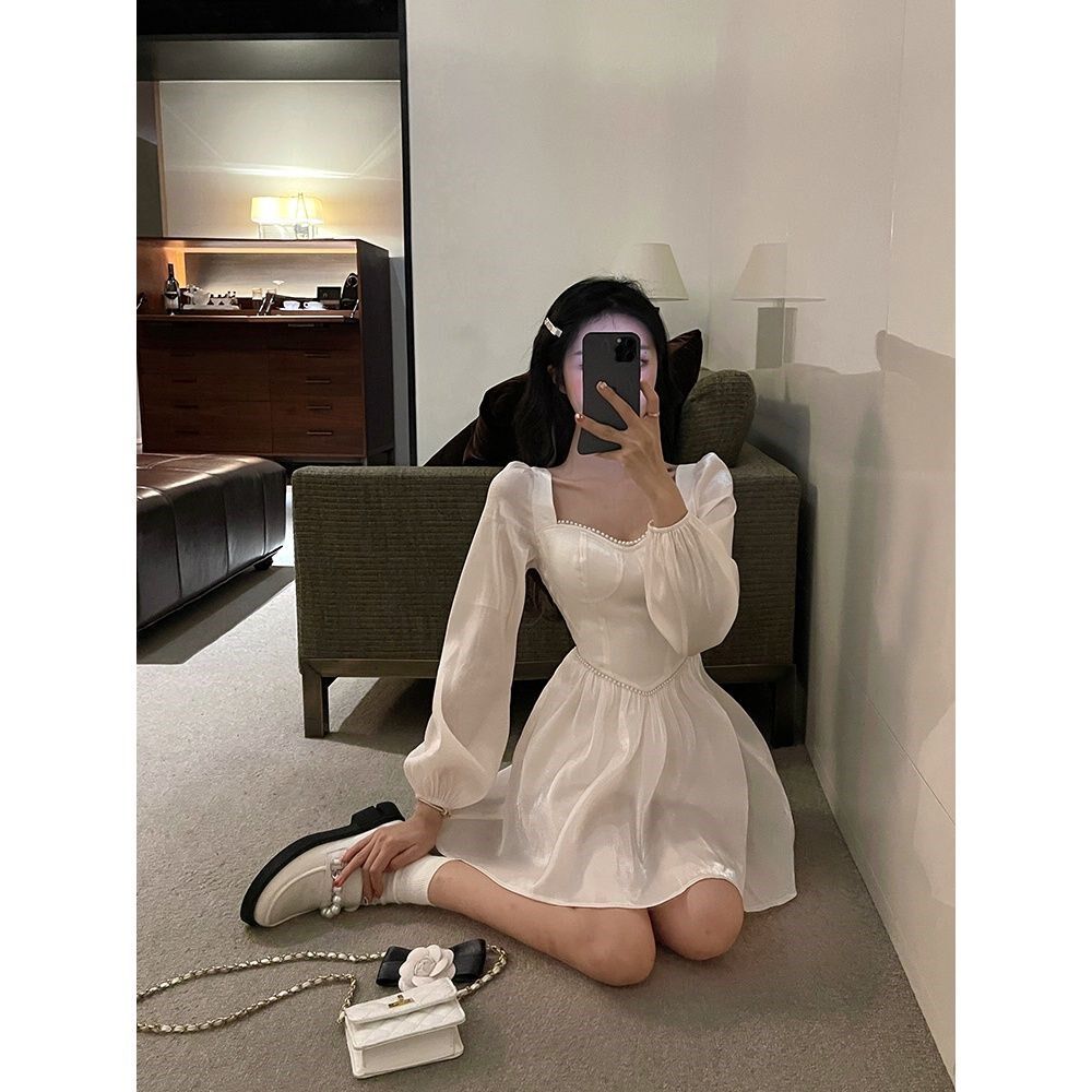 Gentle Wind Dress Woman Early Autumn Cash 2022 New Korean version Supper body Slim Fashion Pure Color Pearl A character