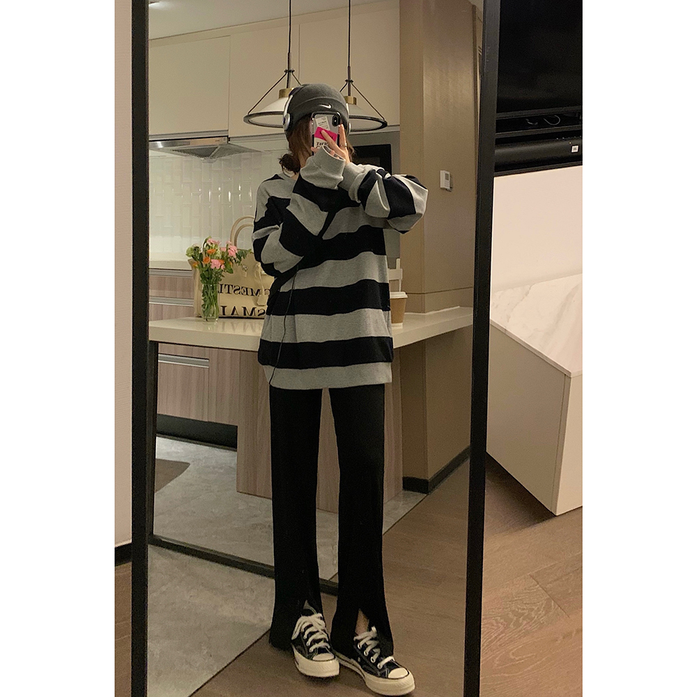 Veee too able to pull proportional ju conspicuously closed eye Conspicuously Slim High Waist Black Open Fork Casual Straight Drum Mopping Pants