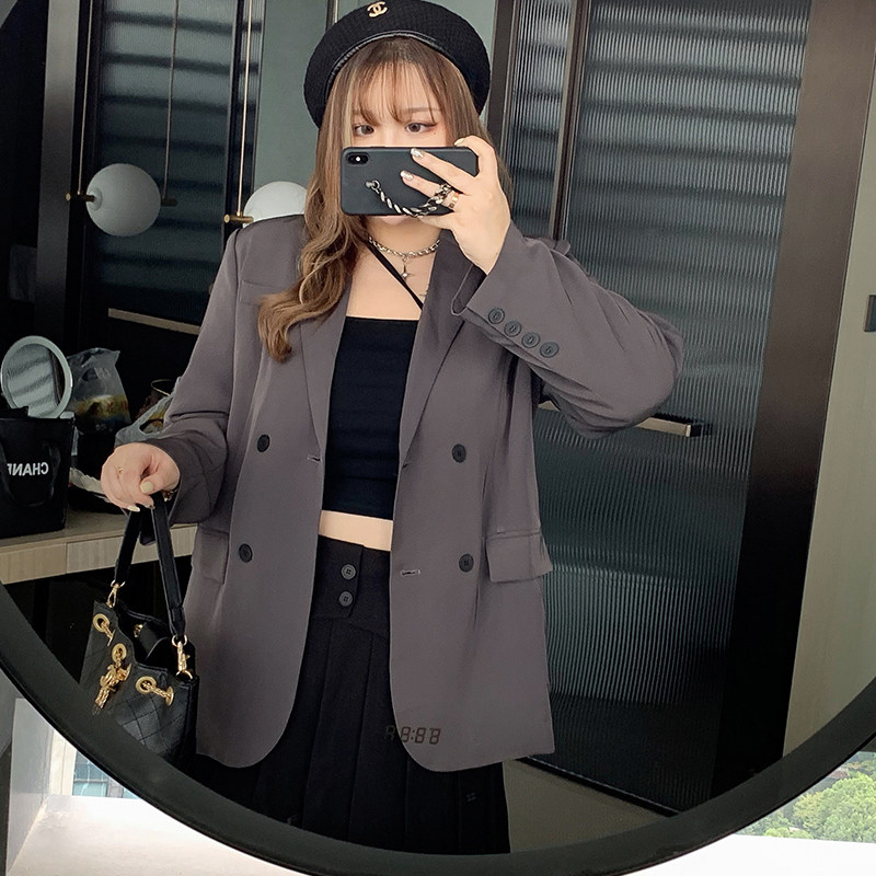 Hitong Big size woman dress Fat mm Korean version Temperament Slim Padded Shoulder Grey Suit Jacket 100 Hitch Casual West Suit Autumn