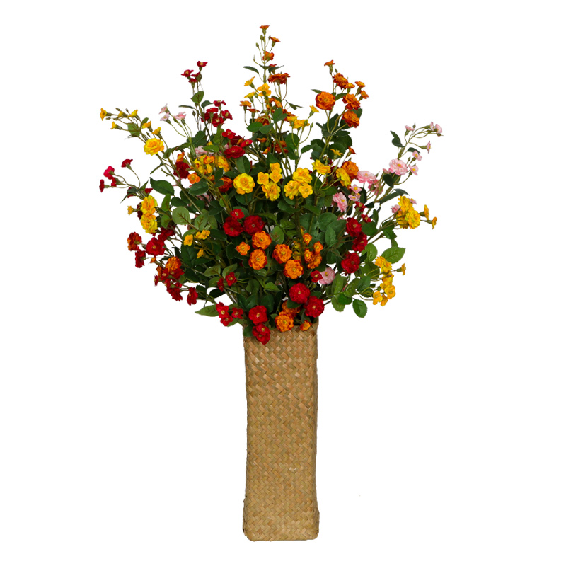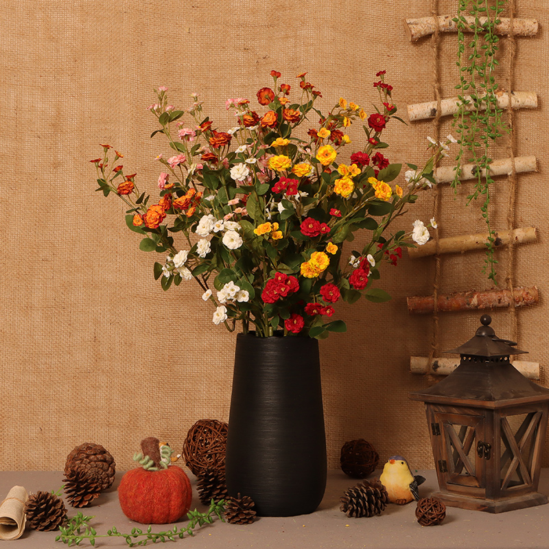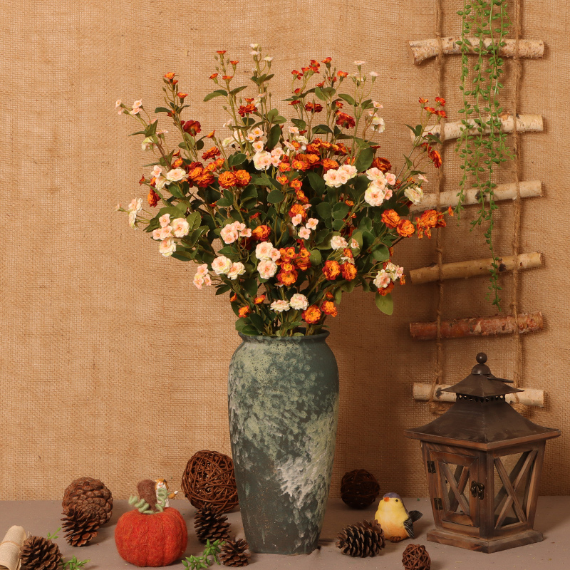 Rosewood flowers orange 5 branches Champagne 5 branches Ancient cyan vases 10 branches rosehips (red 3 yellow 3 orange 2 pink 2) 8 branches Rosaceae flowers (white yellow champagne pink each 2 branches) 1