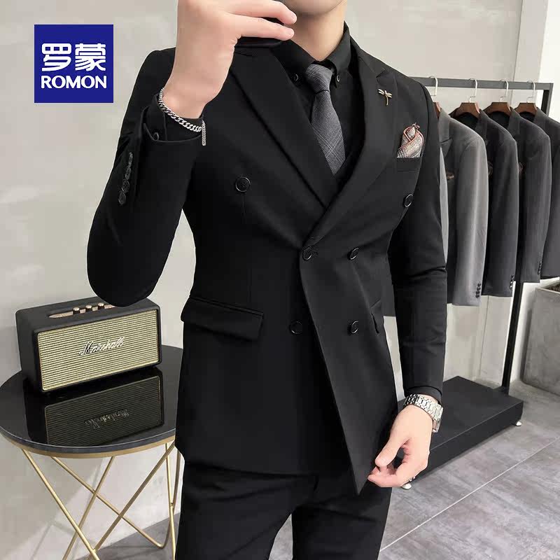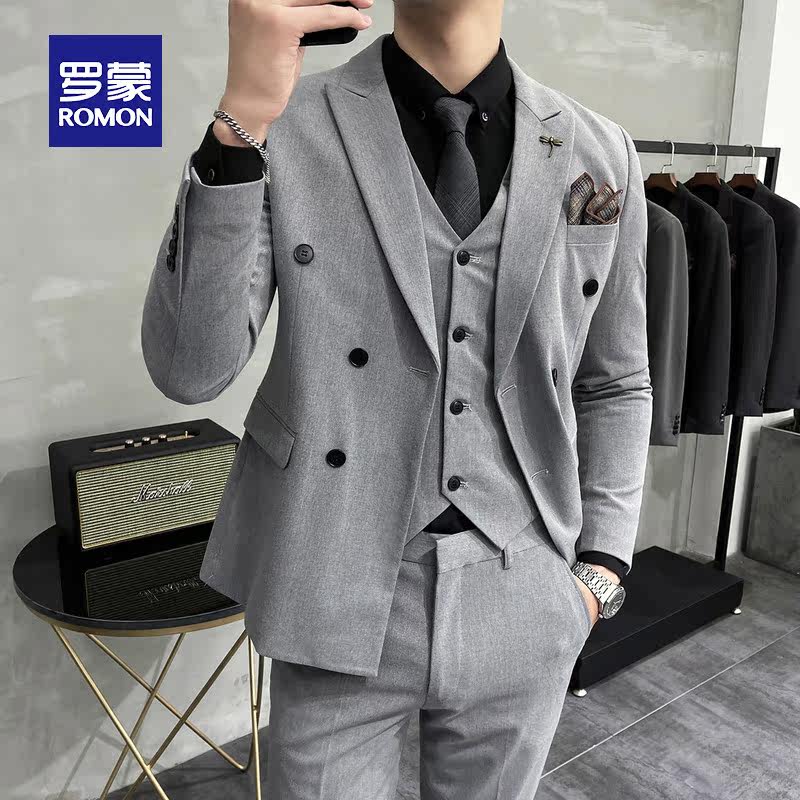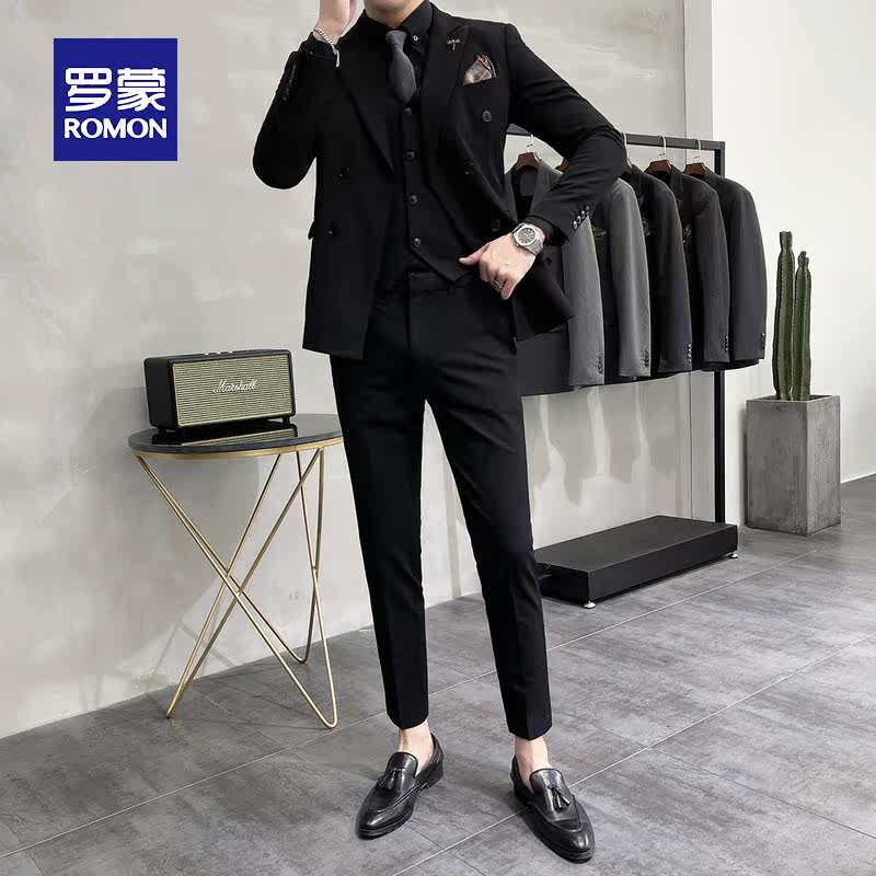 Lomon suit set men's double-breasted groom wedding suit three-piece set of solid color trim body interview formal wear