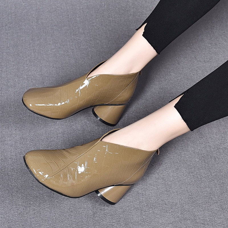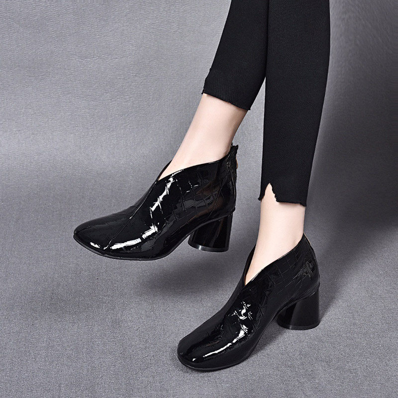 2022 spring new genuine leather coarse heel short boots women painted leather 100 hitch round head fashion nude boots with embossed fashion boots