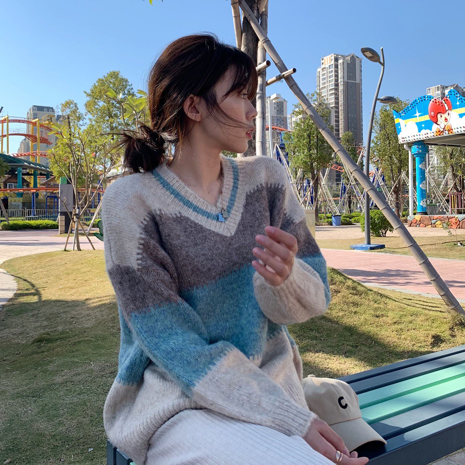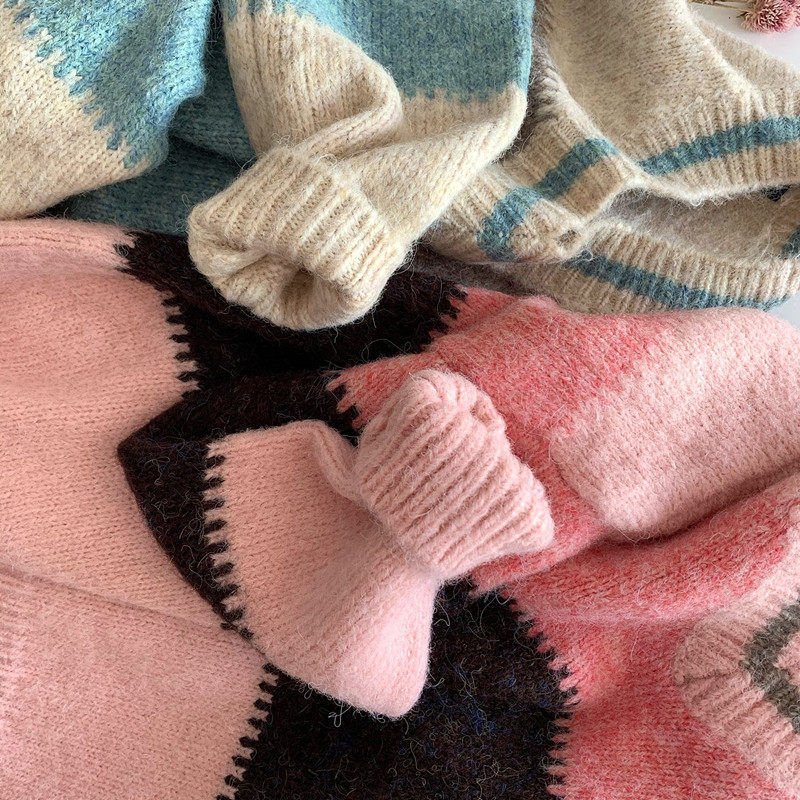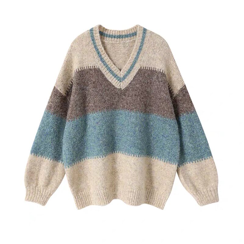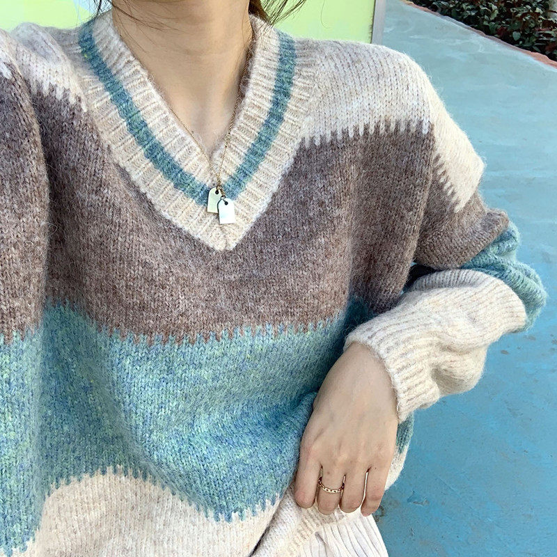 2021 autumn and winter new V-neck color matching alpaca pullover niche design loose gentle lazy style sweater women