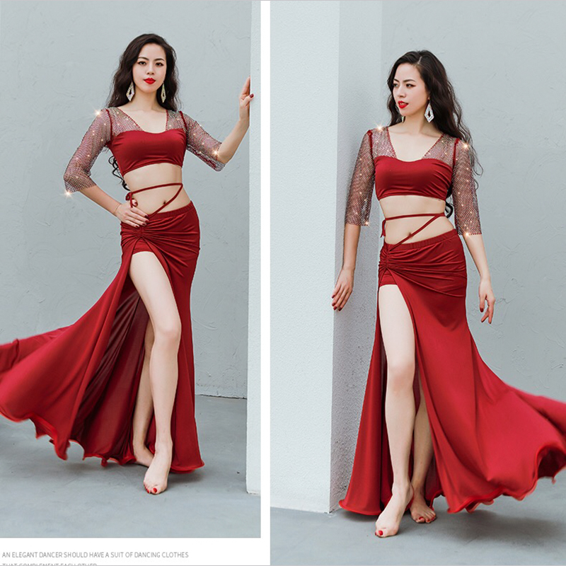 2022 new oriental belly leather dance black rehearsdress sexy ice silk screen yarn single open fork fish tail skirt suit woman