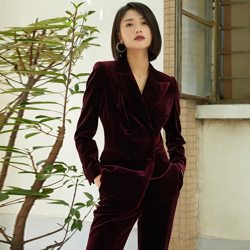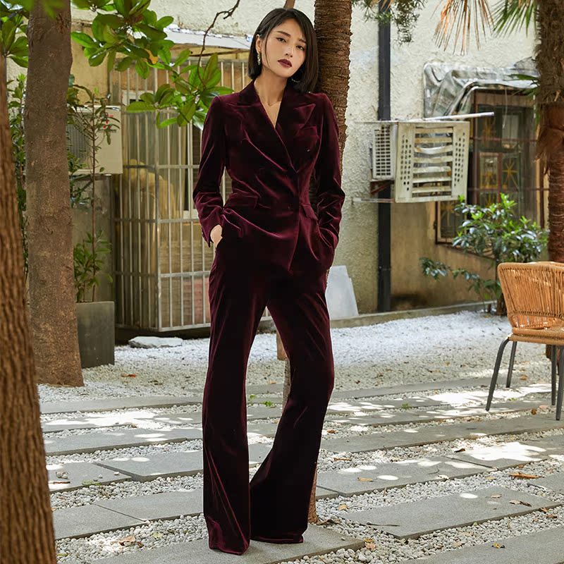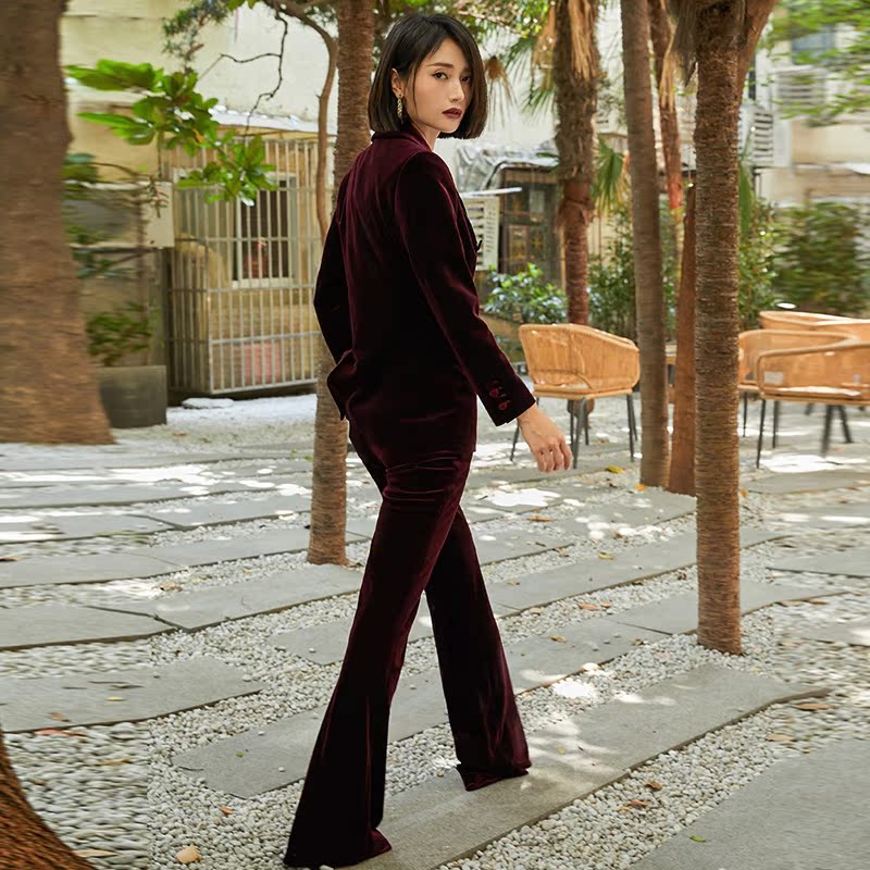 Fall/Winter 2021 new burgundy double-breasted velvet suit fashion temperament suit flared pants two-piece set