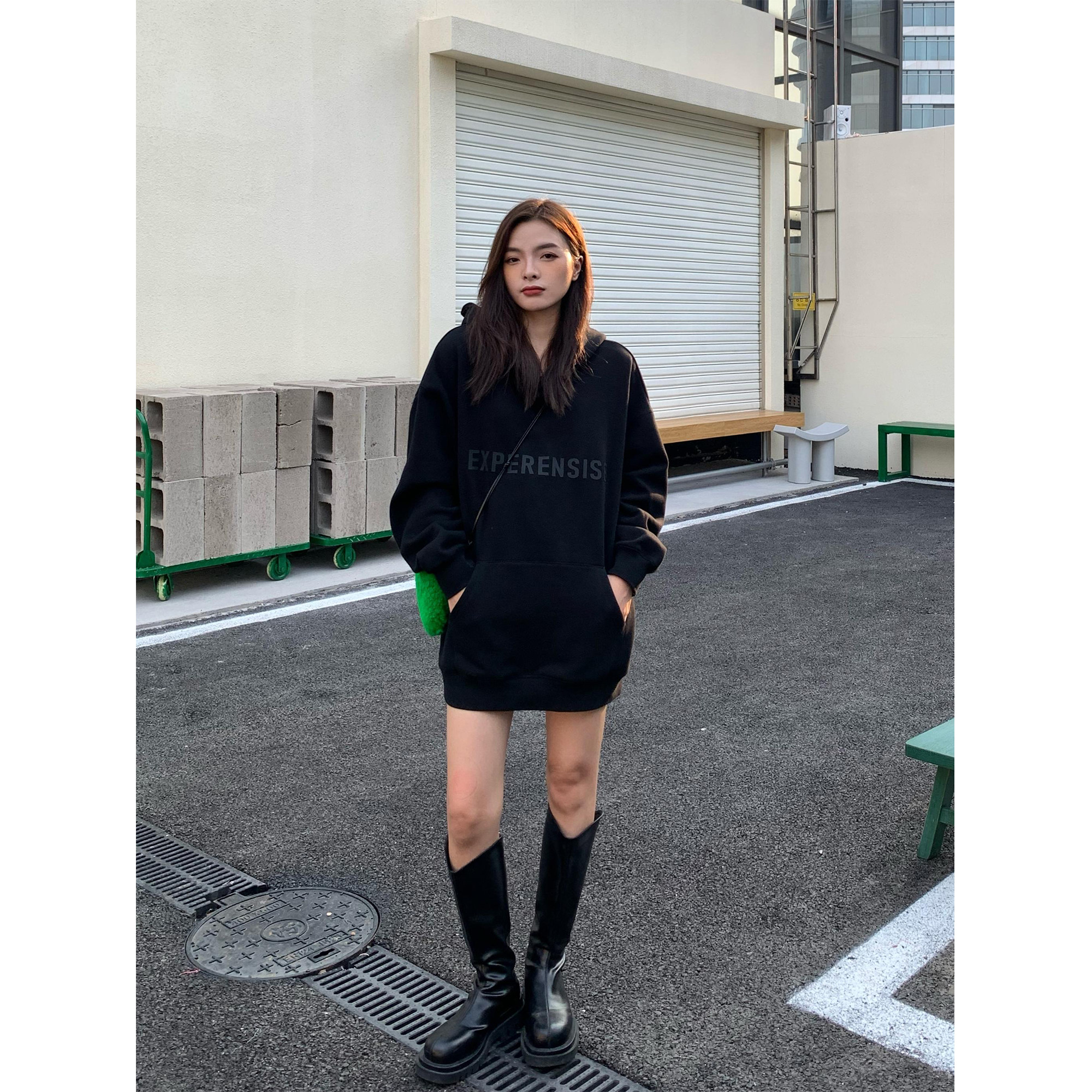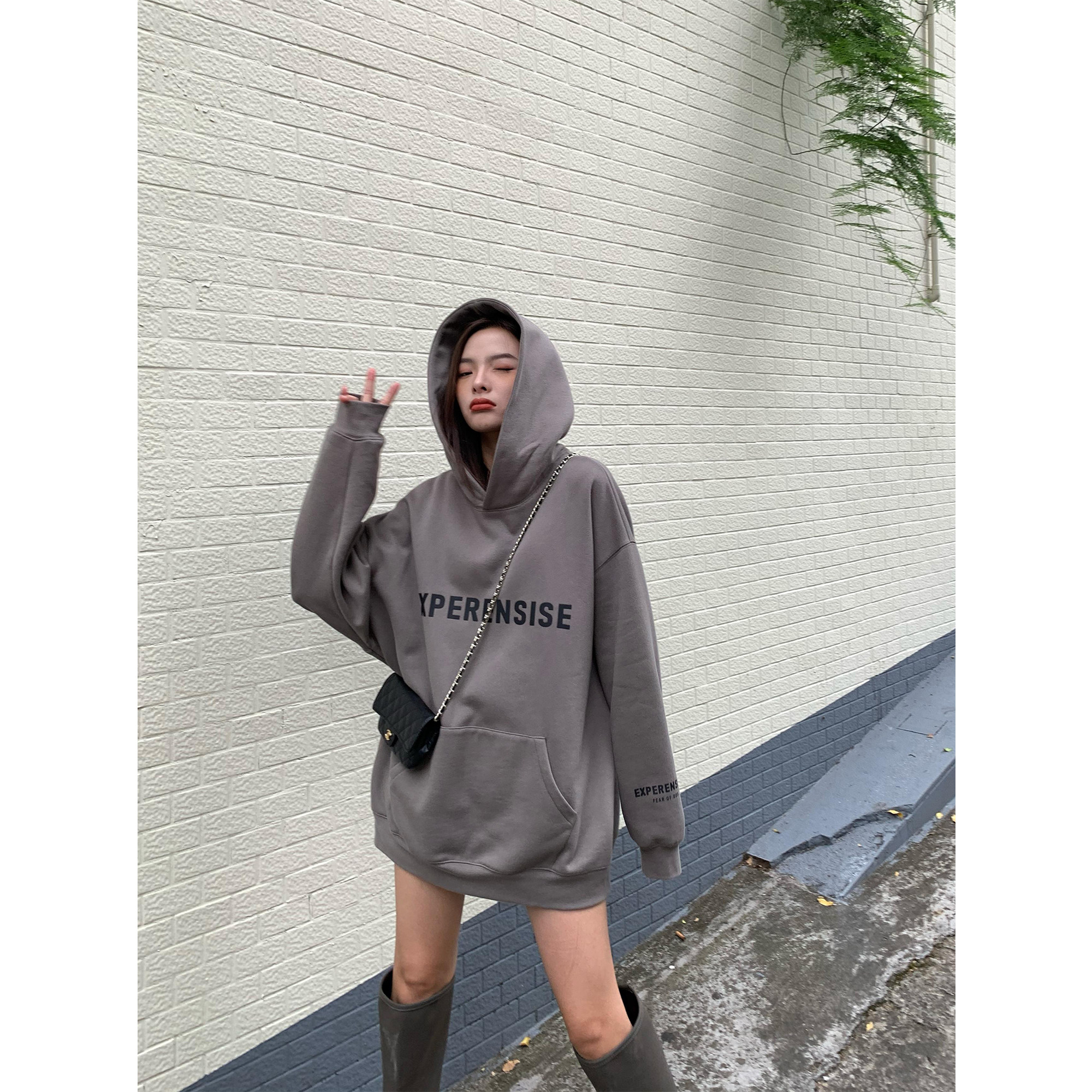 Chen Mifan black hooded plus velvet thick cotton T women's autumn and winter 2022 new loose mid-length gray top