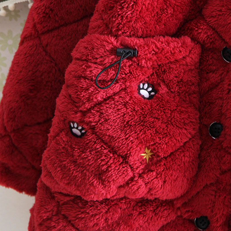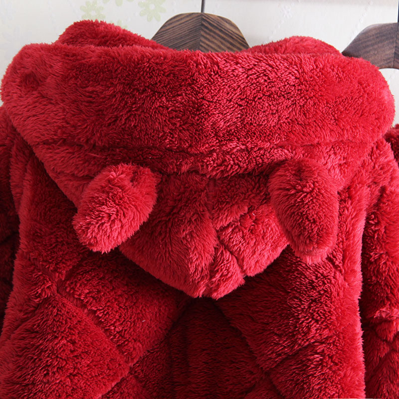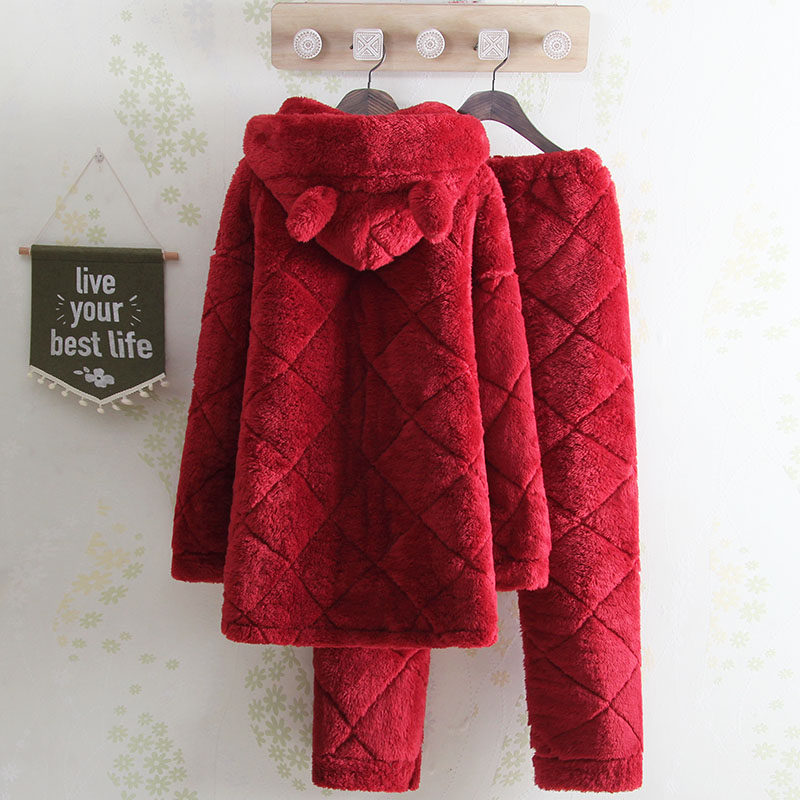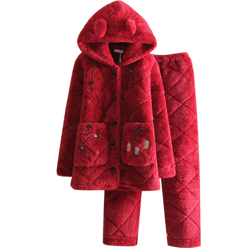 Even cap medium length winter three-layer thickened laminated cotton coral suede pyjamas lady red warm personality Korean version home dress