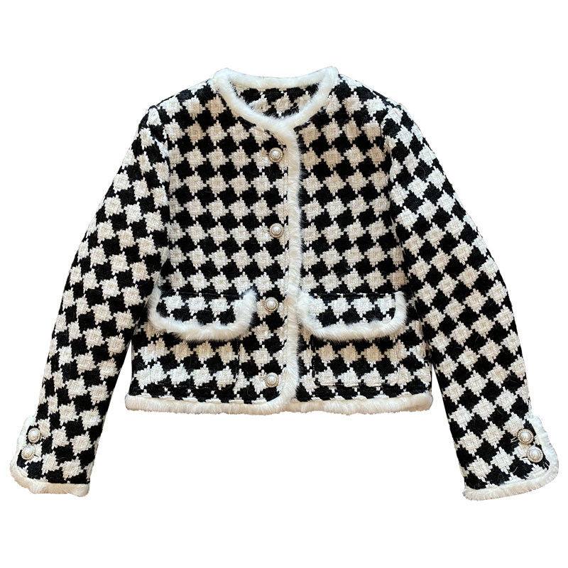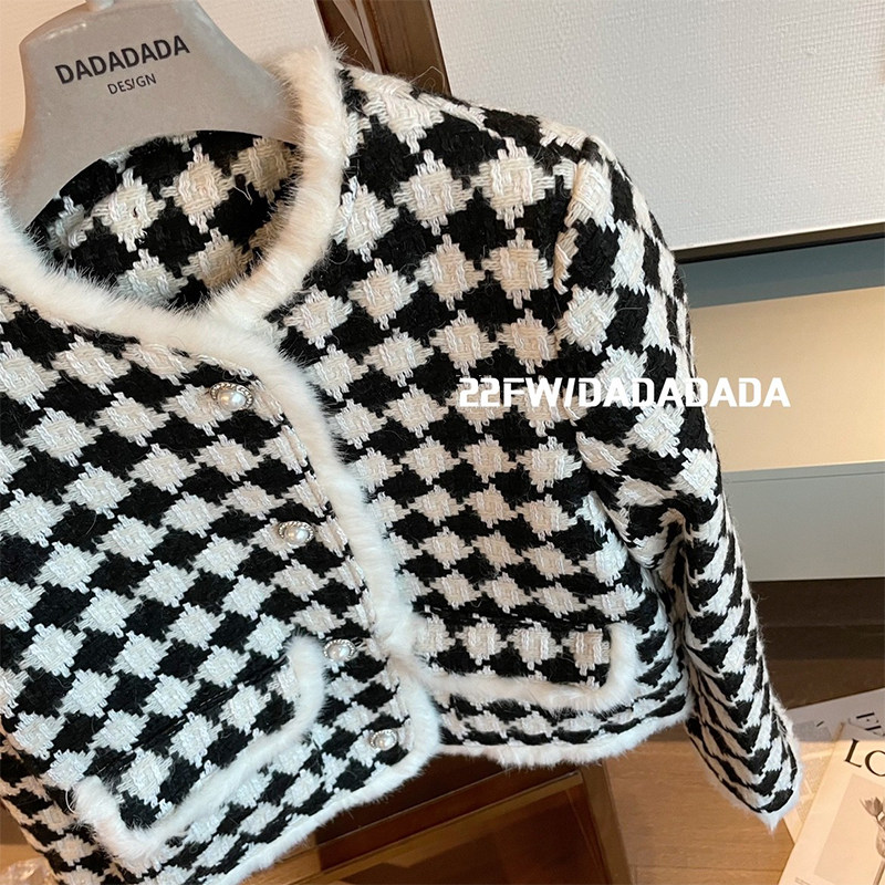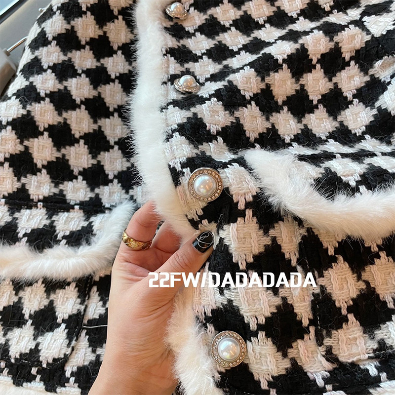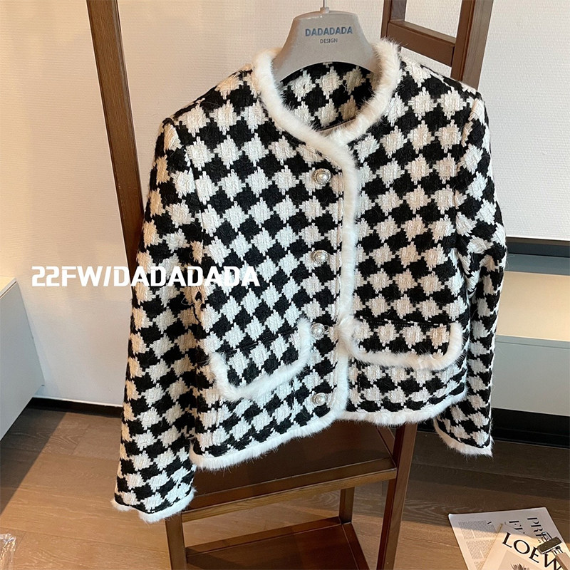 DADA Xiaoxiang ladies wind checkerboard plaid short coat women's light luxury mink fur edge design houndstooth top