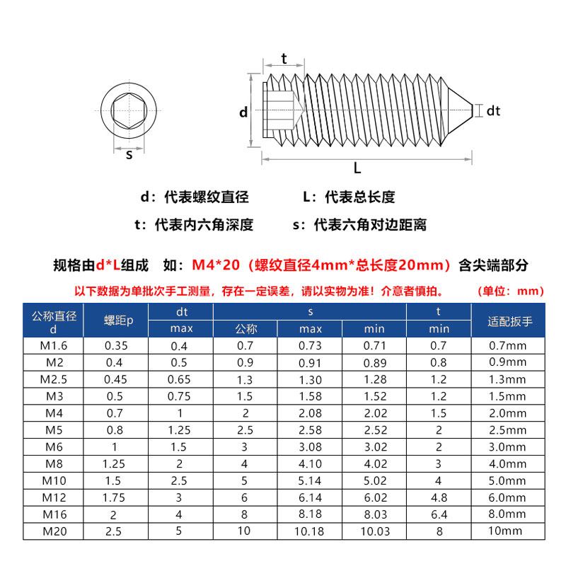 M3M4M5N6N8N10 316 stainless steel pointed set screw inner hexagonal headless machine meter*3x4x5x6x30
