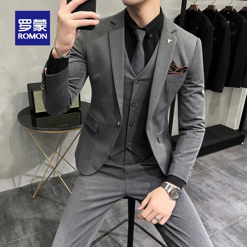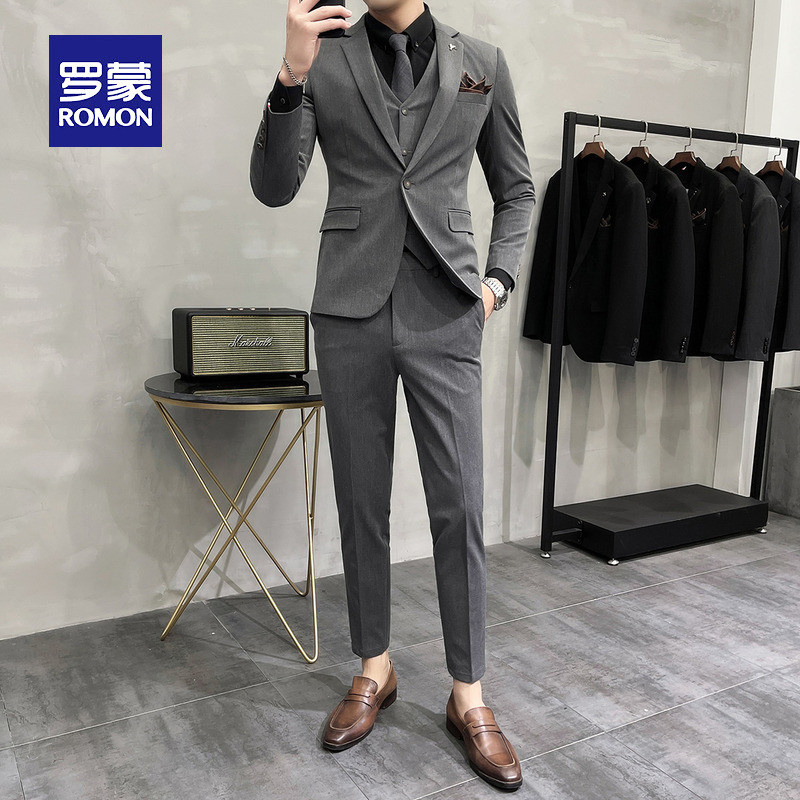 Romon dark striped suit suit men's slim suit three-piece interview work uniform groom wedding dress
