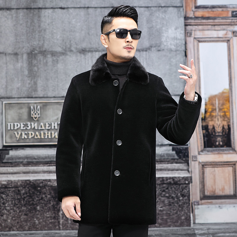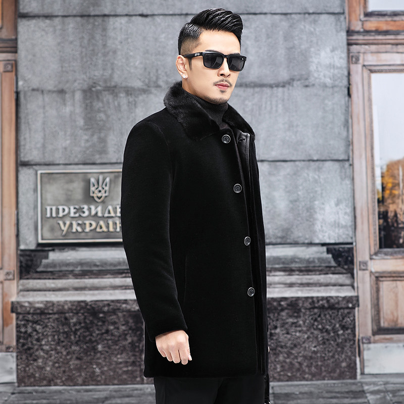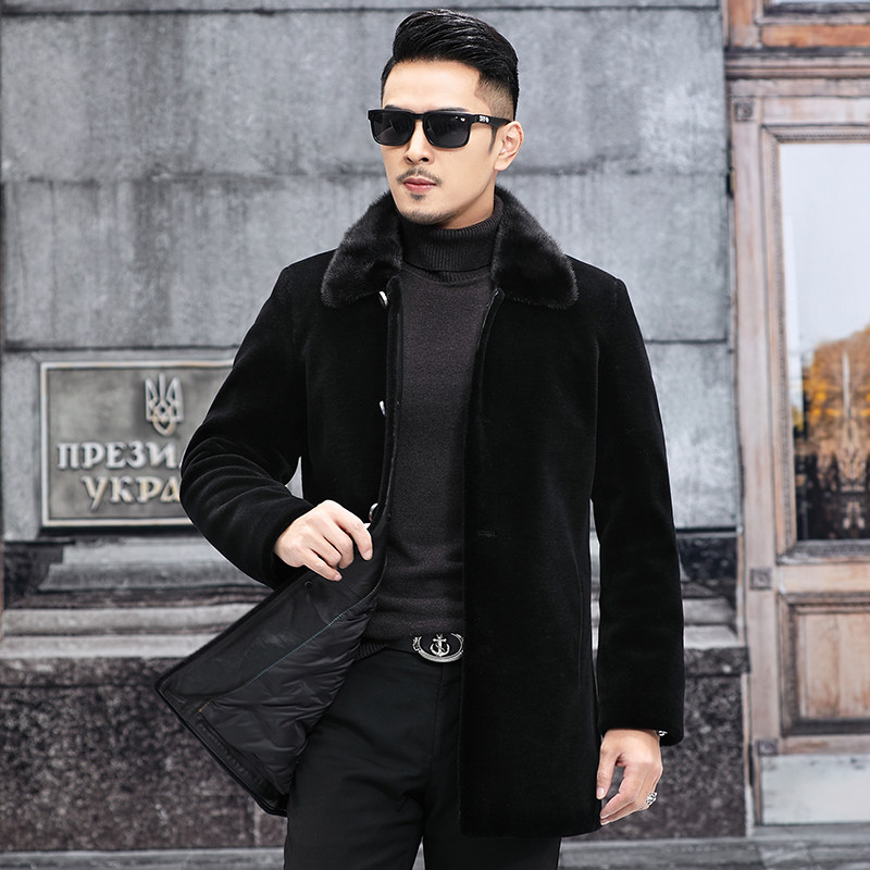 New leather jacket mink wool collar sheep cut short medium and long version of leather wool one men's coat wool fur coat