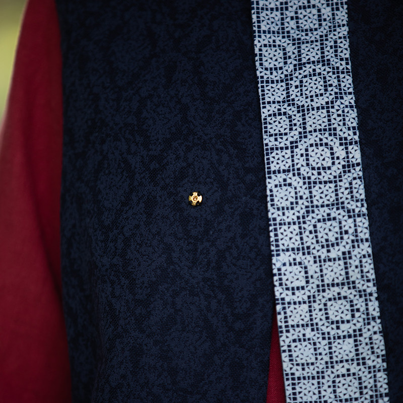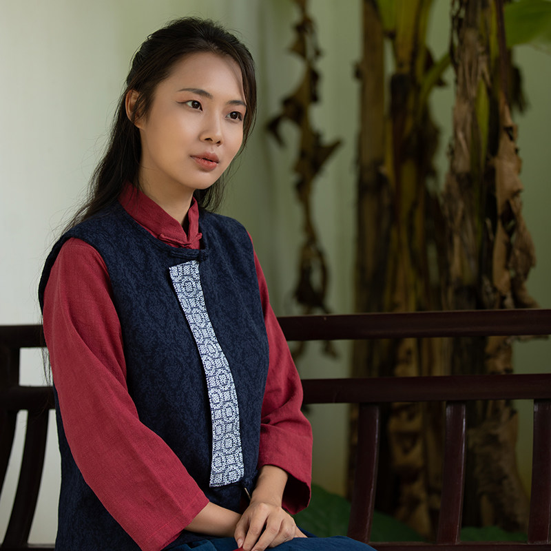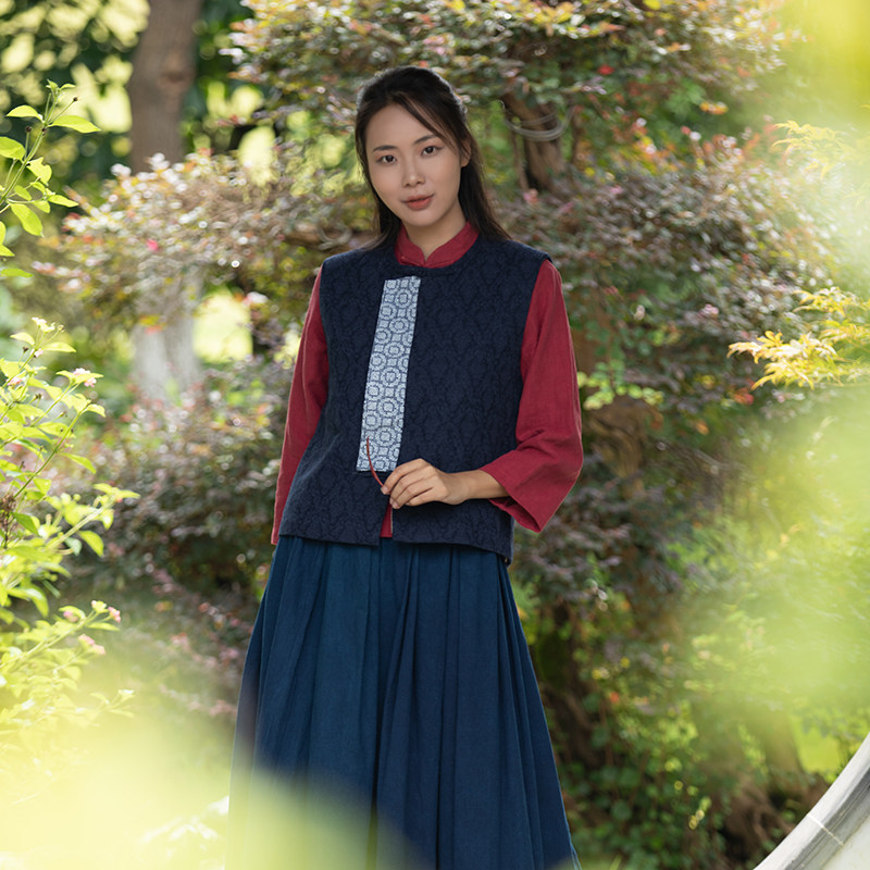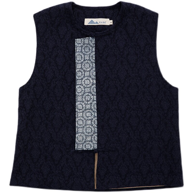 Our native country Wind handmade batik cotton linen jacquard dark grain fabric round neckline splicing Chinese waistcoat Vest Disc Buckle