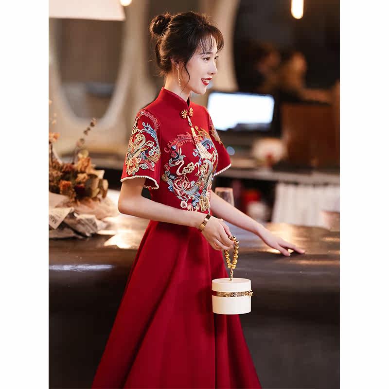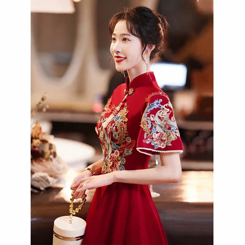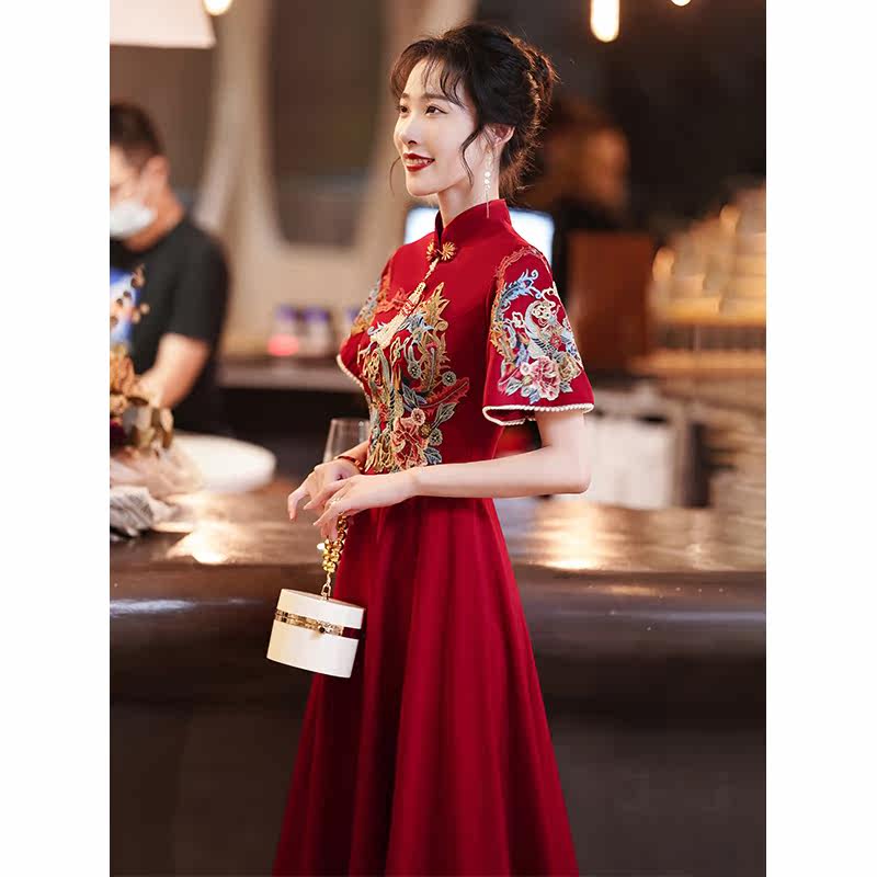 Toast clothing bride cheongsam wine red winter engagement dress wedding dress thank you banquet Chinese Xiuhe clothing covering arms