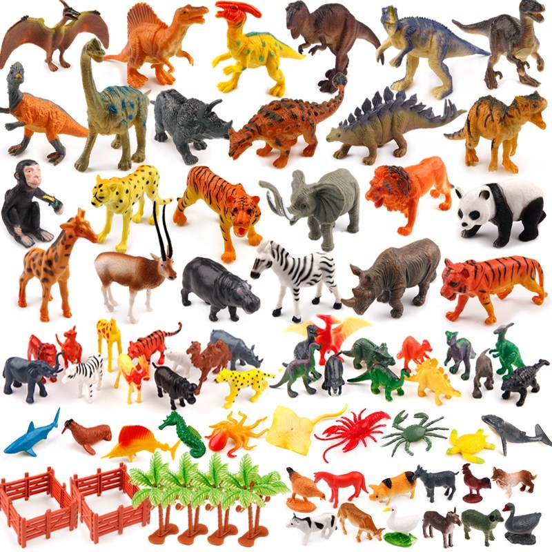 12 Small Dinosaurs 12 Animals 4 Fences 2 Trees Specifications 60 Piece Sets Small Dinosaur Animal World Specifications