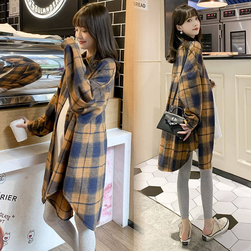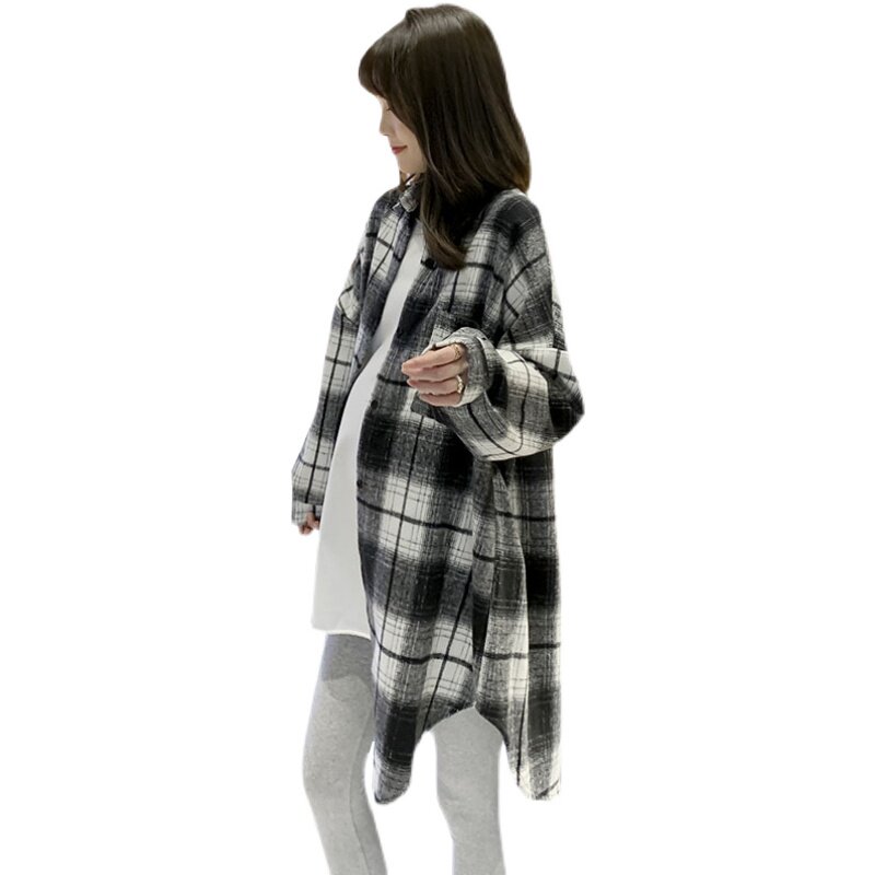 Spring New Maternity Dress Loose Medium and Long Plaid Shirt Foreign Pie Coat Fashion Backing Shirt Foreign Pie Set