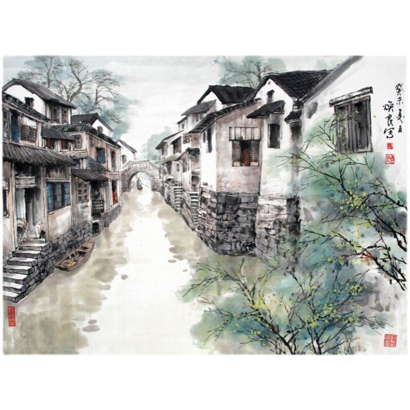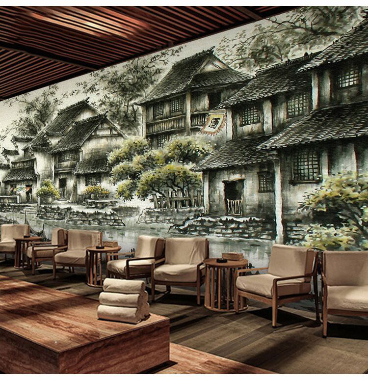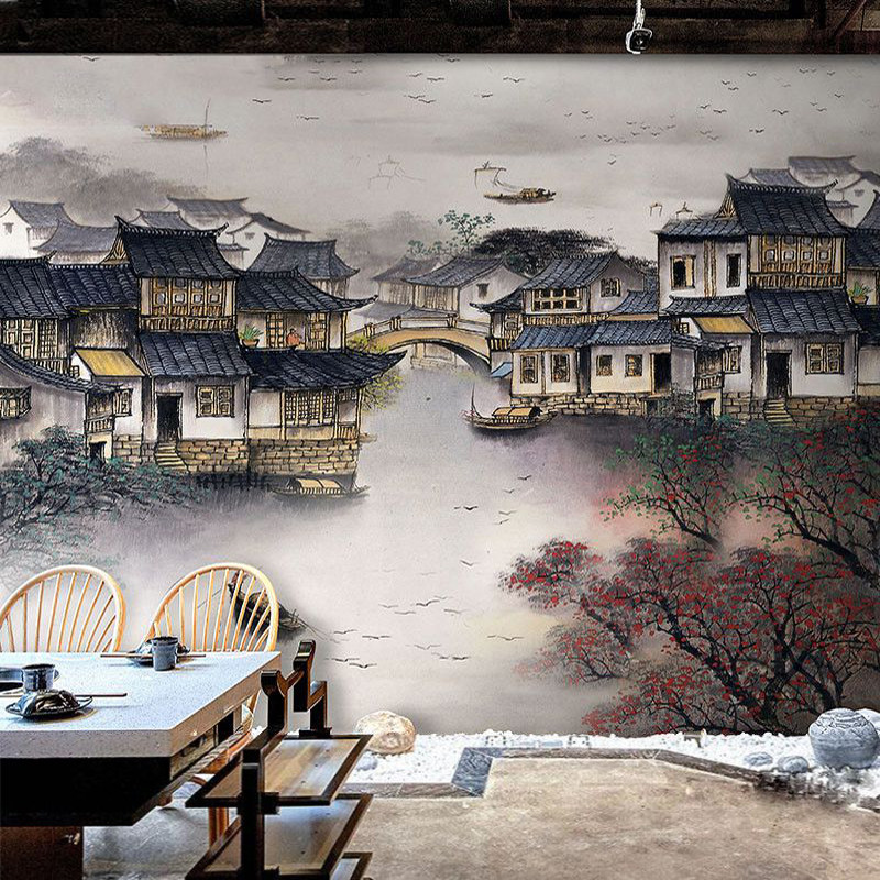 Jiangnan water town painting environmental protection bamboo wood fiber integrated board artistic conception ink painting restaurant restaurant moisture-proof fast installation wall panel