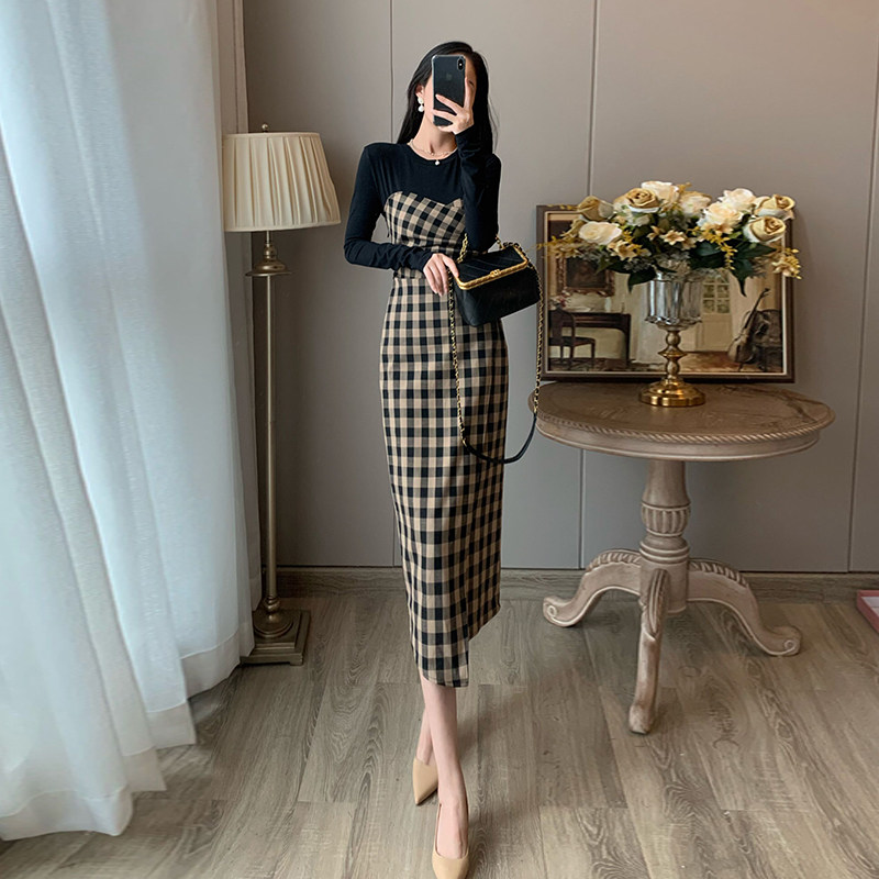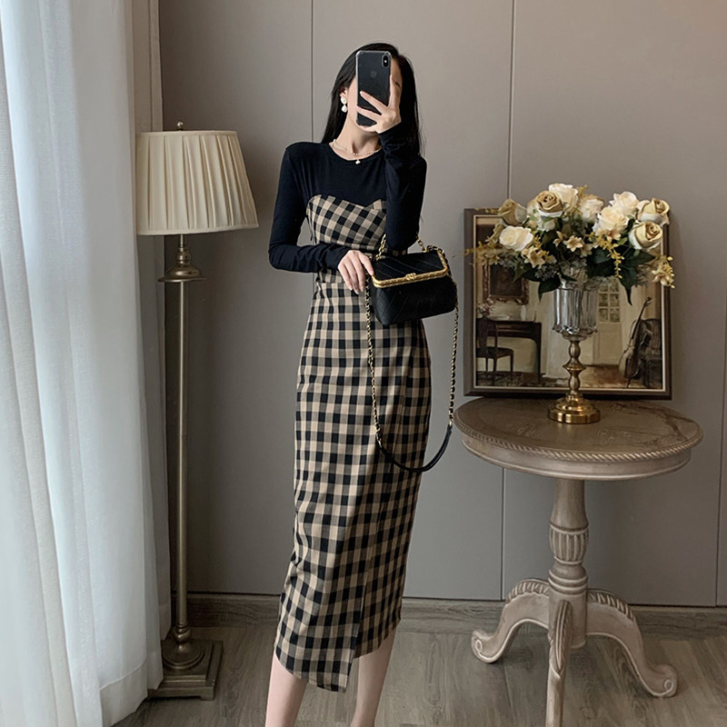 French retro temperament niche design plastic dress clothes slim skirt long skirt early spring woman