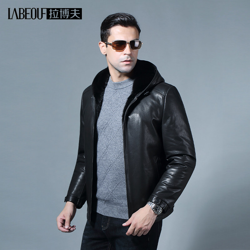 Labov Men's Mink Liner Genuine Cotton Sheepskin Leather Leather Jacket Large Size Yard locomotive with cap daddy leather jacket