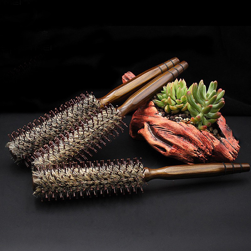 Solid Wood Comb Curly Hair Comb Pig Mane Inner Button Cylindrical Roll Comb Blow Hair Styling Roll Comb Home Hair Salon Men and women